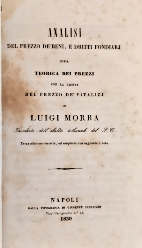 ANALISI DEL PREZZO DEI BENI E DRITTI FONDIARJ ossia teorica dei prezzi con la giunta del prezzo dei vitalizj di Luigi Morra. Napoli, dalla tipografia di Giuseppe Carluccio, 1850. 268 pagine. Copertina coeva in mezza pelle con titoli dorati al dorso. Stato di conservazione: molto buono (fioriture diffuse, firma di appartenenza) Libro antico diritto legge giurisprudenza