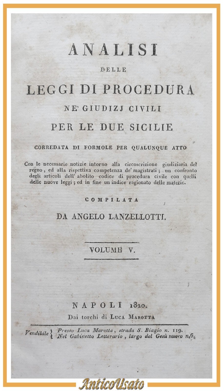 ANALISI DELLE LEGGI DI PROCEDURA NE' GIUDIZI CIVILI PER LE DUE SICILIE di Angelo Lanzellotti. Volume V + indice rilegati insime.