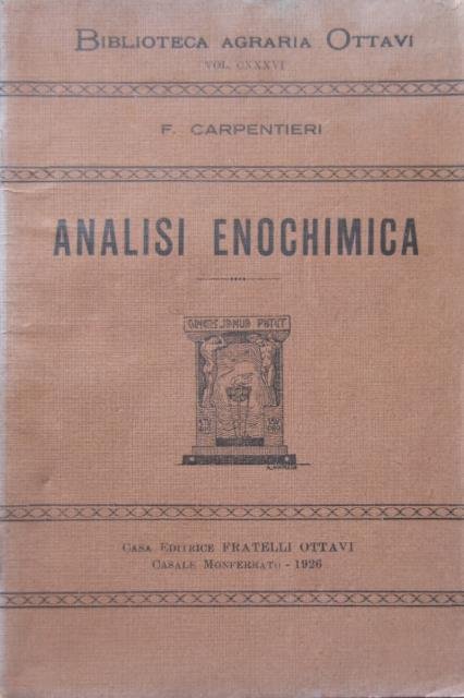Biblioteca Agraria Ottavi, Casa Editrice Fratelli Ottavi, Casale Monferrato, 1926. In 12esimo, pp. XVI (di Indice), 328 + molte altre con l'elenco della “Biblioteca Agraria Ottavi” e con inserzioni pubblicitarie, bross. edit. in carta marrone con titoli in nero. Tutto ciò che si deve sapere per la corretta preparazione chimica dei vini. Etichetta della Casa Editrice Fratelli Ottavi. Buono.