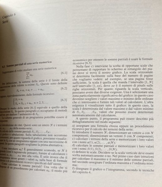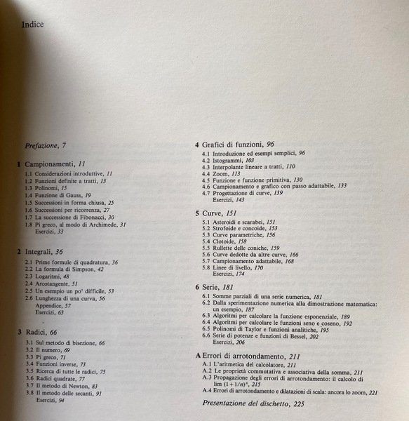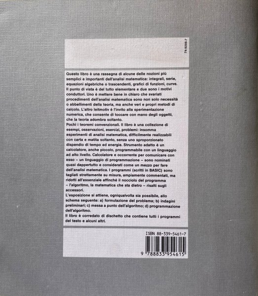 RARO. Questo libro è una rassegna di alcune delle nozioni più semplici e importanti dell'analisi matematica: integrali, serie, equazioni algebriche o trascendenti, grafici di funzioni, curve. Il punto di vista è del tutto elementare e due sono i motivi conduttori. Uno è mettere bene in chiaro che svariati procedimenti dell'analisi matematica sono non solo necessità o abbellimento della teoria, ma anche veri e propri metodi di calcolo. L'altro leitmotiv è l'invito alla sperimentazione numerica, che consente di toccare con mano degli oggetti, che la teoria adombra soltanto.