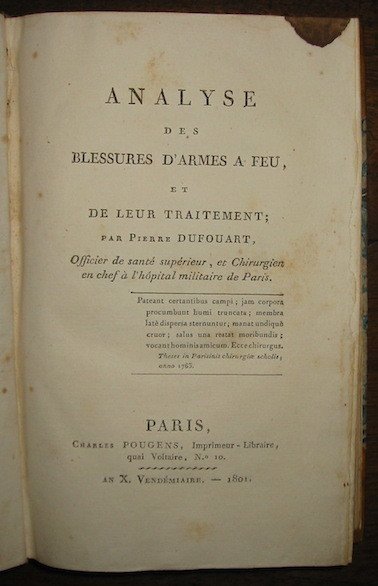 8vo (cm.26), XV-425(3) pp. Legatura coeva in mz. pelle con angoli (leggermente allentata). Fregi e titolo oro al dorso. Una macchia d’inchiostro al margine superiore delle prime carte in numerazione romana e qualche lieve fioritura sulle ultime pagine, altrimenti ottimo esemplare. Pierre Dufouart (1737 - 1807) è stato ufficiale superiore di sanità e Chirurgo ‘en chef’ all’Ospedale militare di Parigi. Questa sua opera ricevette un grande apprezzamento, tanto che ne furono pubblicate ben undici edizioni tra il 1801 e il 1806 in francese e in tedesco. Prima edizione, assai rara.