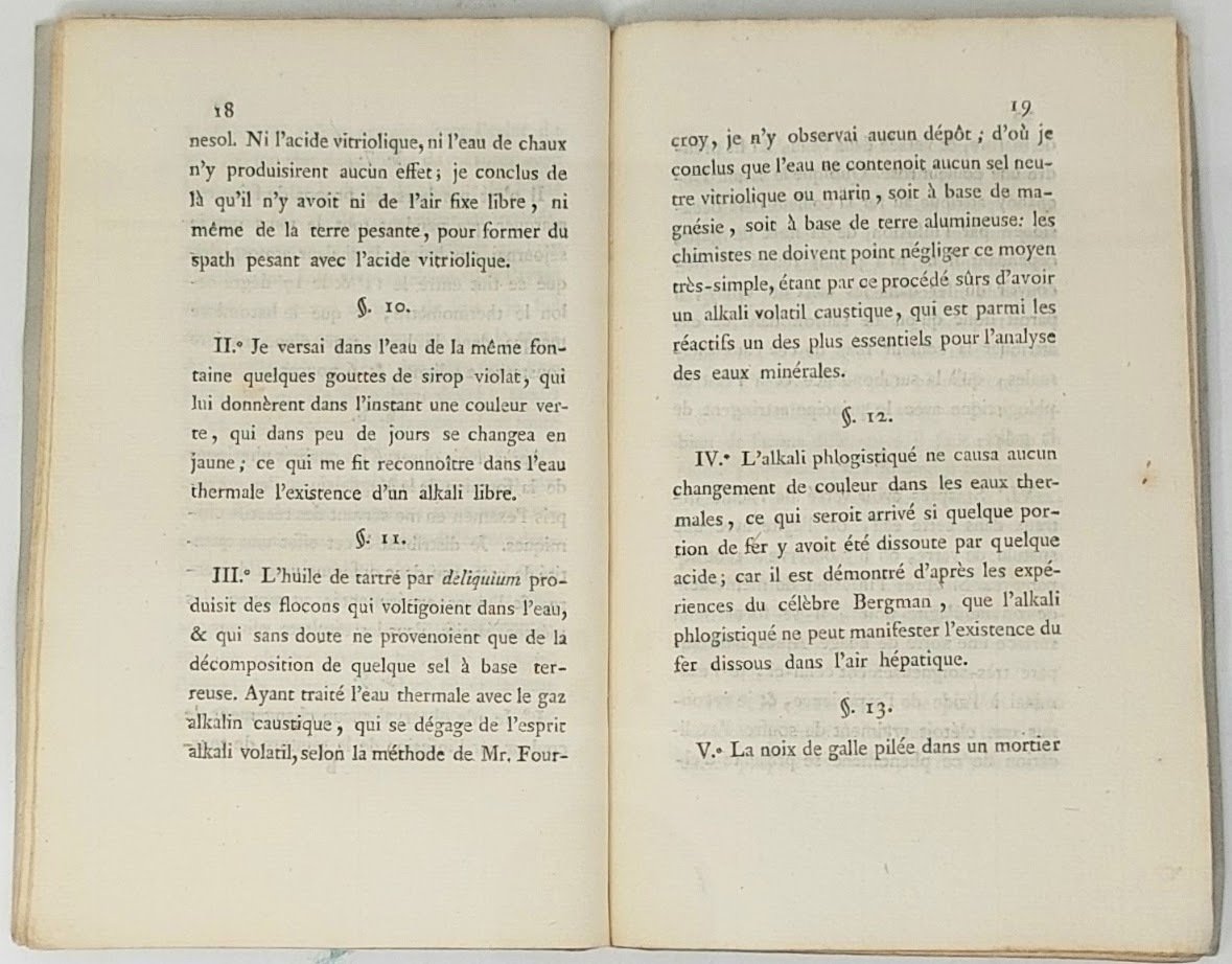 >in-8, pp. 64, broch. (cop. fittizia). Prima edizione in volume a sé di quest'analisi scientifica delle acque termali di Vinadio (apparsa nel primo vol. dell'Accademia delle Scienze di Torino per gli anni 1784-85). L'autore, dopo lungo e circostanziato esame, conclude che le tali acque contengono ''qualitès qui les rendent propres et efficaces dans presques toutes les maladies de nerfs et dans celles qui son produites par l'acreté, la tenacité et la stagnation des humeurs, dans la foiblesse des organes, dans la rigidité des articulations...''. Il trattato espone tutti gli esperimenti fatti dall'Autore ed analizza anche i fanghi termali e le loro proprietà benefiche. Ottimo esemplare.