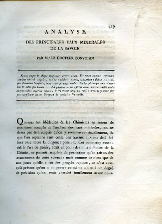 In-4°, pp. 419-454, (1), 1-139, (1) di 'Table des principales observations faites dans les Provinces unies des Pays-bas, pendant le froid rigoureux des mois de décembre 1783, janvier & février 1784'. Brossura marmorizzata posteriore con titolo calligrafato su tassello polilobato al piatto. Due tavv. calcografiche ripiegate f.t. tra le pp. 106-107. In barbe e a pieni margini, con qualche leggerissima brunitura. Ottimo stato. Estratto dai 'Mémoires de la Royale Académie des Sciences de Turin' del 1786. L'esame delle acque minerali savoiarde del Buonvicino è alle pp. 419-454, seguito dai 'Mémoires des Correspondans', cioé, nell'ordine: 1) Pierre François Tingry, 'Recherches analytiques sur les schistes de Sallenche' (pp. 1-106). 2) Jean Senebier, 'Expériences propres a faire connoître les procédés les plus convenables pour fabriquer le savon' (pp. 107-112), 3) Jan Hendrik Van Swinden, 'Observations sur quelques particularités météorologiques de l'année 1783' (113-139). ll Buonvicino, o Bonvicino (Centallo, 1739-Torino, 1810), qui francesizzato in Bonvoisin, medico e chirurgo a Torino, fu membro dell'Accademia delle Scienze e lasciò numerose memorie chimiche e scientifiche. Il Tingry (Soissons, 1743-Ginevra, 1821), chimico e farmacista, fu professore di scienze naturali a Ginevra e autore di numerose memorie relative ad analisi chimiche di acque minerali e allo studio, tra l'altro, della fosforescenza animale, dell'elettricità, dell'acido fosforico, etc. Il Senebier (Ginevra, 1742-ivi, 1809) fu scienziato e uomo di lettere, bibliotecario nella propria città natale. Gli si debbono studi, fra l'altro, sulla composizione atmosferica, sugli effetti della luce solare, sulla chimica organica, sugli igrometri, etc. Il Van Swinden (L'Aja, 1746-Amsterdam, 1823) fu professore di fisica, astronomia e filosofia ad Amsterdam. Ingente la sua produzione scientifica, disseminta in un gran numero di monografie e di memorie. Cfr. Poggendorff, I, 342-343 (per il Buonvicino); II, 1110 (per il Tingry); II, 904-905 (per il Senebier); II, 1058-1059 (per Van Swinden).