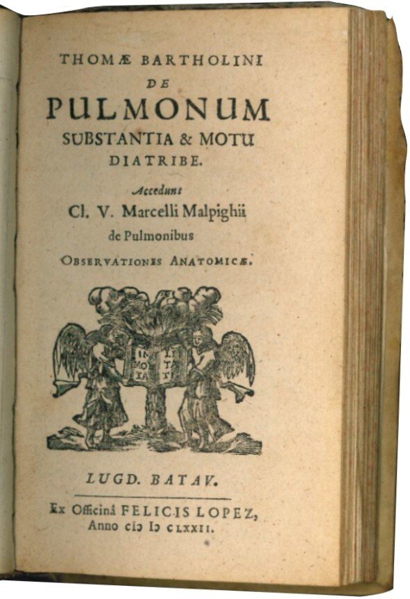 II: Rara seconda edizione (la prima fu stampata a Copenaghen nel 1663) in cui l'autore controbatte alle teorie di Malpighi sulla sostanza e funzione dei polmoni, e pubblica in appendice a questo suo trattato il De pulmonibus, che di fatto contribuisce a diffondere. Thomas Bartholin fu anatomista danese, famoso per esser stato il primo a descrivere completamente, nel 1652, il sistema linfatico umano.