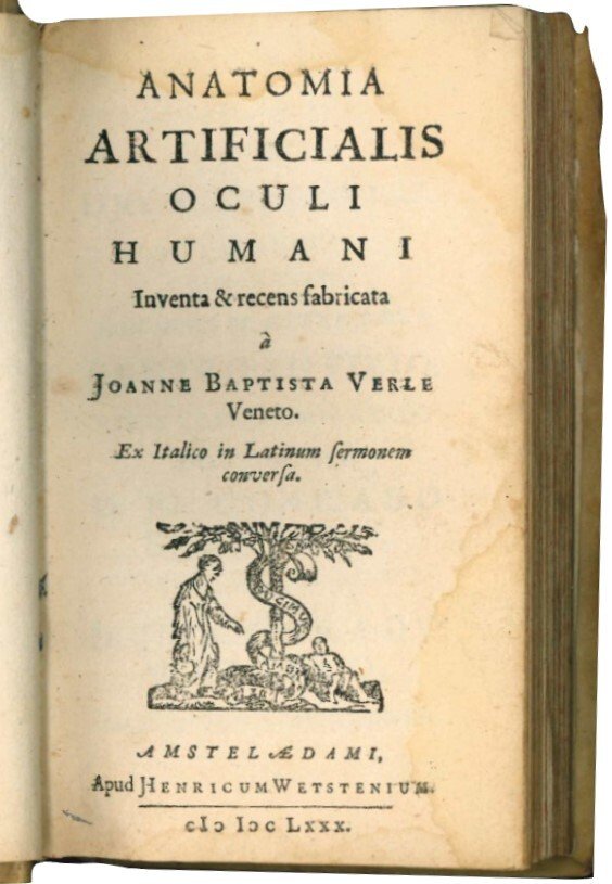 I: Prima edizione latina. Giovan Battista Verle fu anatomista italiano, si dedicò in particolare nella costruzione anatomica artificiale dell'occhio umano. La struttura del bulbo oculare viene infatti descritta ne l'Anatomia artificialis oculi humani, pubblicata per la prima volta a Firenze nel 1679 e dedicata al Principe di Toscana Ferdinando de' Medici.