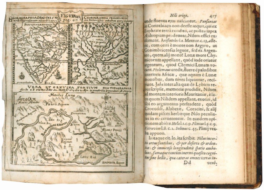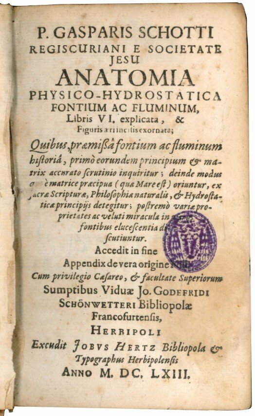 One of the two variant issues of the first edition. Gaspar Schott was a German Jesuit and scientist, specializing in the fields of physics, mathematics and natural philosophy. He taught mathematics and physics at Mainz and Würzburg. During the last years of his life, he decided to publish the material he had collected on scientific subjects both from his own researches and those of others. He produced in eight years (1658-1666) eleven books. The Anatomia physico-hydrostatica is on the “origin of springs. His own opinion, when finally expressed, amounted to saying that everyone was right: some springs are due to precipitation, some to underground condensation, and some connected directly to the sea” (DSB). The section on the discovery of the source of the Nile contains material related to the discovery of the “true source of the Nile” (1618 by Pierre Pays).