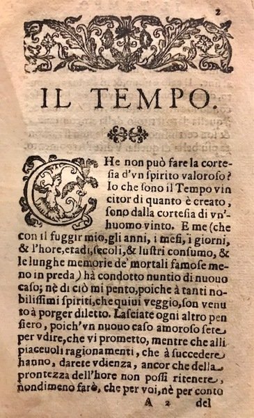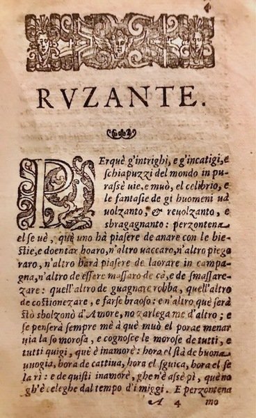 8vo (cm. 14,6), 40 cc. Marca tipografica al frontespizio. Fregi e capilettera xilografici. Cartonato rigido alla rustica. Esemplare in ottimo stato di conservazione, estratto dall’edizione ‘Tutte le opere del famosissimo Ruzante.’. Allacci, 82. Br. Libr., p. 96.