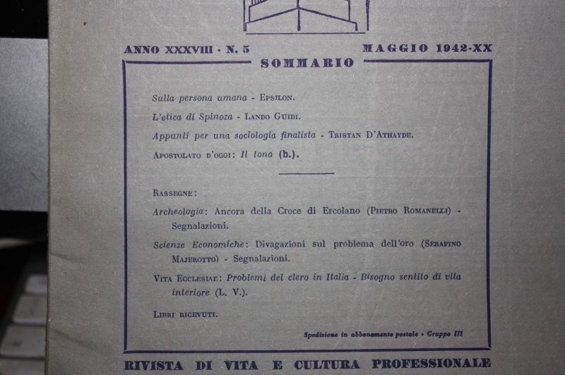STUDIUM N.5 MAGGIO 1942, SOMMARIO, L'ETICA DI SPINOZA DI LANDO GUIDI, SULLA PERSONA UMANA DI EPSILON, ARCHEOLOGIA ANCORA DELLA CROCE DI ERCOLANO PIETRO ROMANELLI DA PAG 133 A PAG 160