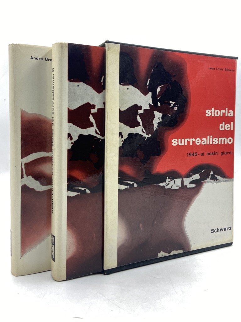 Due volumi in tela editoriale con sovraccoperta illustrata e cofanetto rigido illustrato, cm 22 x 16, pp 245 (7), 277 (3); 72 tavole in nero nel primo volume, 60 nel secondo. Manca la prima sguardia, bianca, di un volume. Cofanetto che raccoglie nel primo volume le Entretiens avec André Parinaud (1952), conversazioni radiofoniche in cui il più influente dei surrealisti racconta la propria vita e quella del movimento, e nel secondo il lavoro di Jean-Louis Bédouin, critico letterario e anch’egli poeta surrealista, dedicato alla storia di questa avanguardia nel dopoguerra fino al 1960. Entrambi i volumi comprendono una corredo di fotografie e illustrazioni e una sezione di documenti, manifesti e dichiarazioni. Traduzioni di Livio Maitan e Tristan Sauvage.