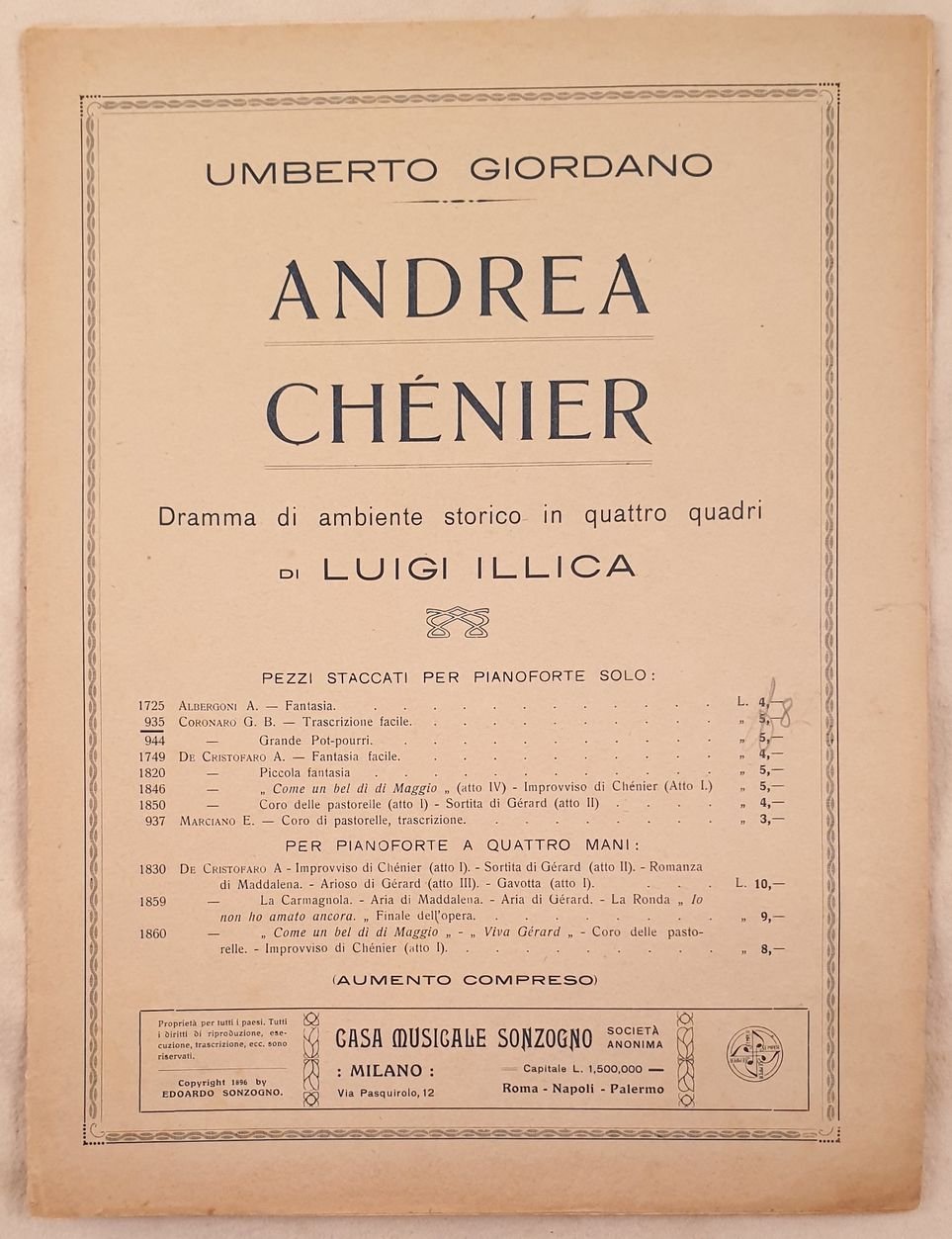 Spartito musicale del 1896 dell'opera lirica in quattro atti "Andrea Chenier" di Umberto Giordano (1867-1948) su libretto di Luigi Illica (1857-1919) ispirata alla vita del poeta francese Andrè Chenier (1762-1794). La prima rappresentazione ebbe luogo al Teatro la Scala di Milano il 28 Marzo 1896. Trascrizione facile per pianoforte di Gellio Benvenuto Coronaro. In buone condizioni. Brossura editoriale in ottime condizioni generali con lievi usure e strappi ai margini e dorso. Legatura editorialmente assente. All'interno le pagine si presentano in buone condizioni con rare fioriture. In 4. Dim. 33x25 cm. Pp. 10.musical score of 1896 of the work in four acts "Andrea Chenier" by Umberto Giordano (1867-1948) on booklet by Luigi Illica (1857-1919) inspired to the real life of the french poet Andrè Chenier (1762-1794). The first representation took place in the Teatro La Scala in Milan the 28th of March 1896. Easy transcription for piano by Gellio Benvenuto Coronaro. In good conditions. Illustrated editorial cover. Editorial cover in good general conditions slightly worn in the edges and spine. Binding editoriarly missing. Inside pages are in good conditions with occasional foxings. In 4. Dim. 33x25 cm. Pp. 10.