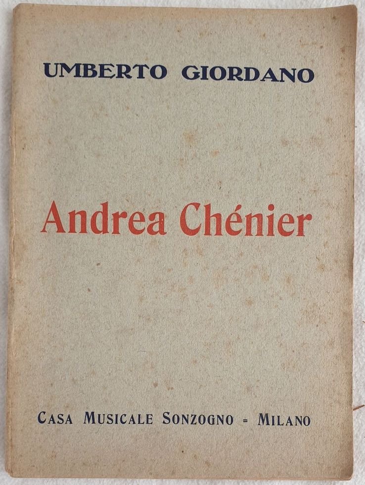 Libretto musicale del 1930 dell'opera lirica in quattro atti "Andrea Chenier" di Umberto Giordano (1867-1948) su libretto di Luigi Illica (1857-1919) ispirata alla vita del poeta francese Andrè Chenier (1762-1794).<BR>La prima rappresentazione ebbe luogo al Teatro la Scala di Milano il 28 Marzo 1896.<BR>In buone condizioni. <BR>Brossura editoriale in buone condizioni generali con lievi usure ai margini e dorso, fioriture. Segni di penna al piatto posteriore. Legatura in buone condizioni. Pagine in buone condizioni con rare fioriture. In 16. Dim. 18,5x13,5 cm. Pp. 71.