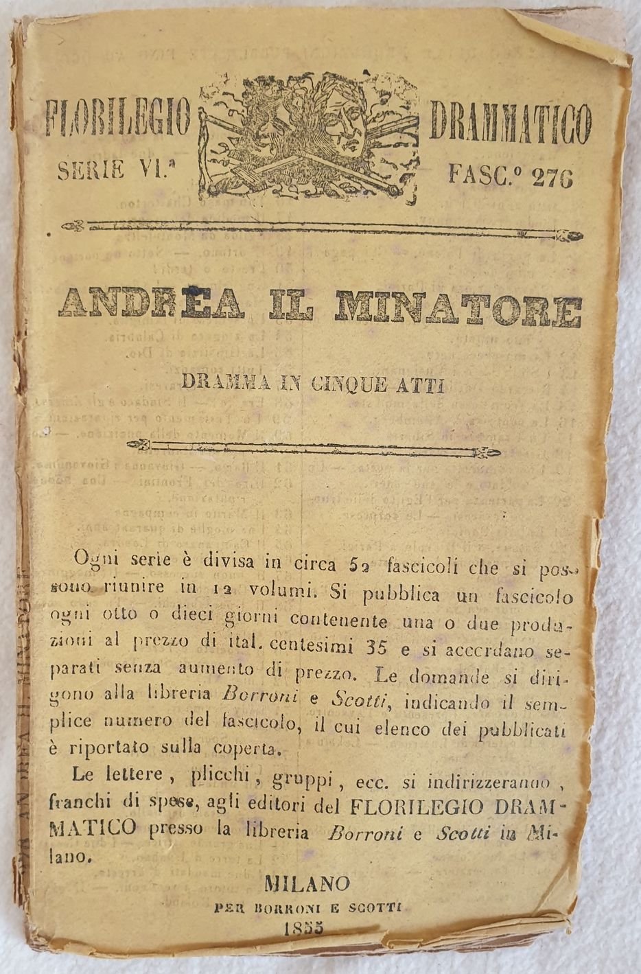 Edizione del 1855 della collana "Florilegio drammatico" del dramma "Andrea il Minatore". Note manoscritte al frontespizio. Brossura editoriale originale. In buone condizioni.Copertina editoriale in buone condizioni generali con lievi usure ai margini e dorso. Legatura in buone condizioni. All'interno le pagine si presentano in buone condizioni con fioriture. In 16. 16x9,5 cm. Pp. 75+(1)Edition of 1855 of this famous play of the drama "Andrea il Minatore". Handwritten notes in the title page. Editorial original cover. In good conditions. Editorial cover in good general conditions lightly worn in the extremities. Binding in good conditions. Inside pages are in good conditions with foxing. In 16. 16x9,5 cm. Pp. 75+(1).