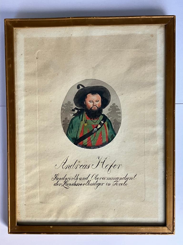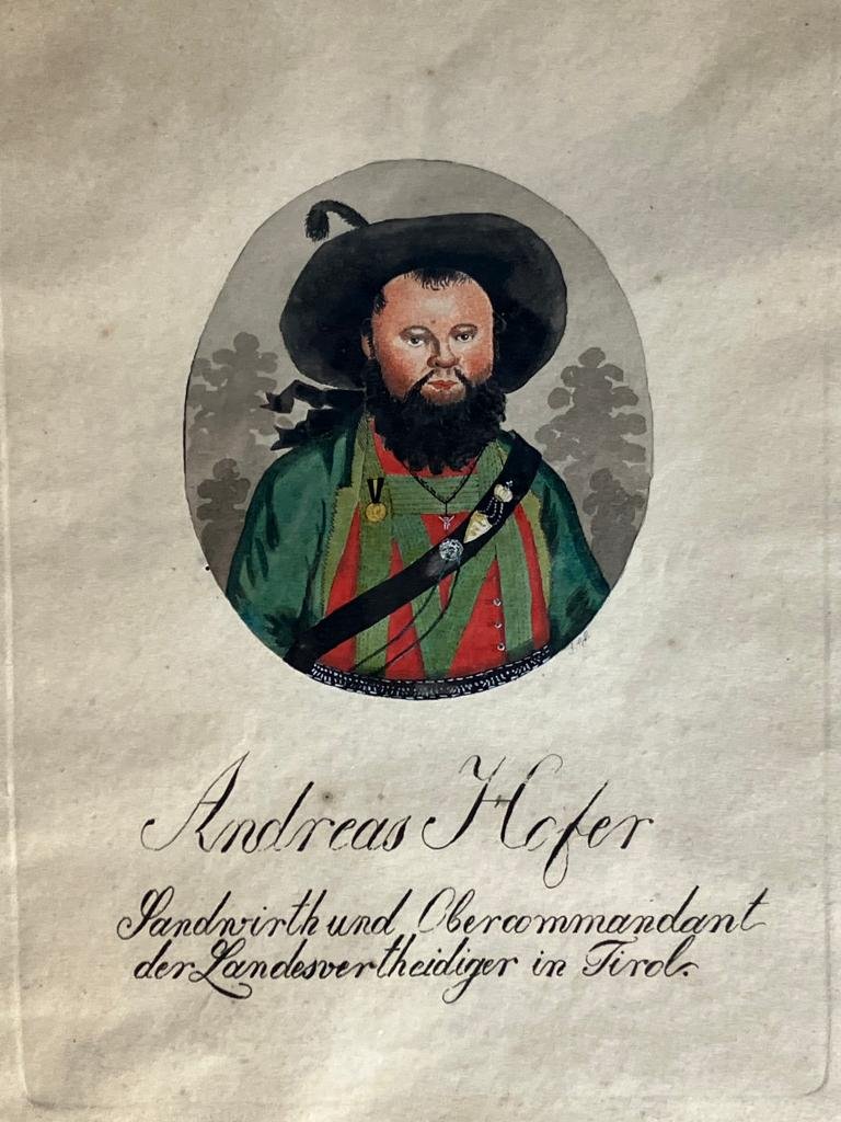 - Andreas Hofer, locandiere operoso e ispiratore della rivolta tirolese contro, gli eserciti occupanti, è diventato l’incarnazione dei combattenti per la libertà e, idolo di molti in terre di lingua tedesca.Per riportare il, Tirolo all'Austria, e sostenuto dell'imperatore Francesco I, Hofer guida l'insurrezione dei tirolesi contro l'occupazione, franco-bavarese. La fine dell'appoggio imperiale e ingannato, dalla communità, fu arrestato e giustiziato dai francesi a Mantova nel 1810, Riferimenti: Schloss Schenna collection, www.schloss-schenna.com (non acquerellato)