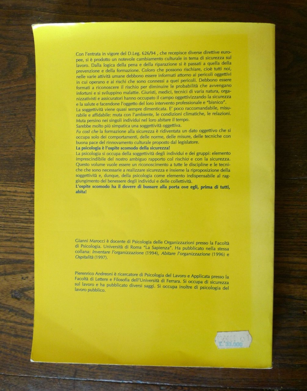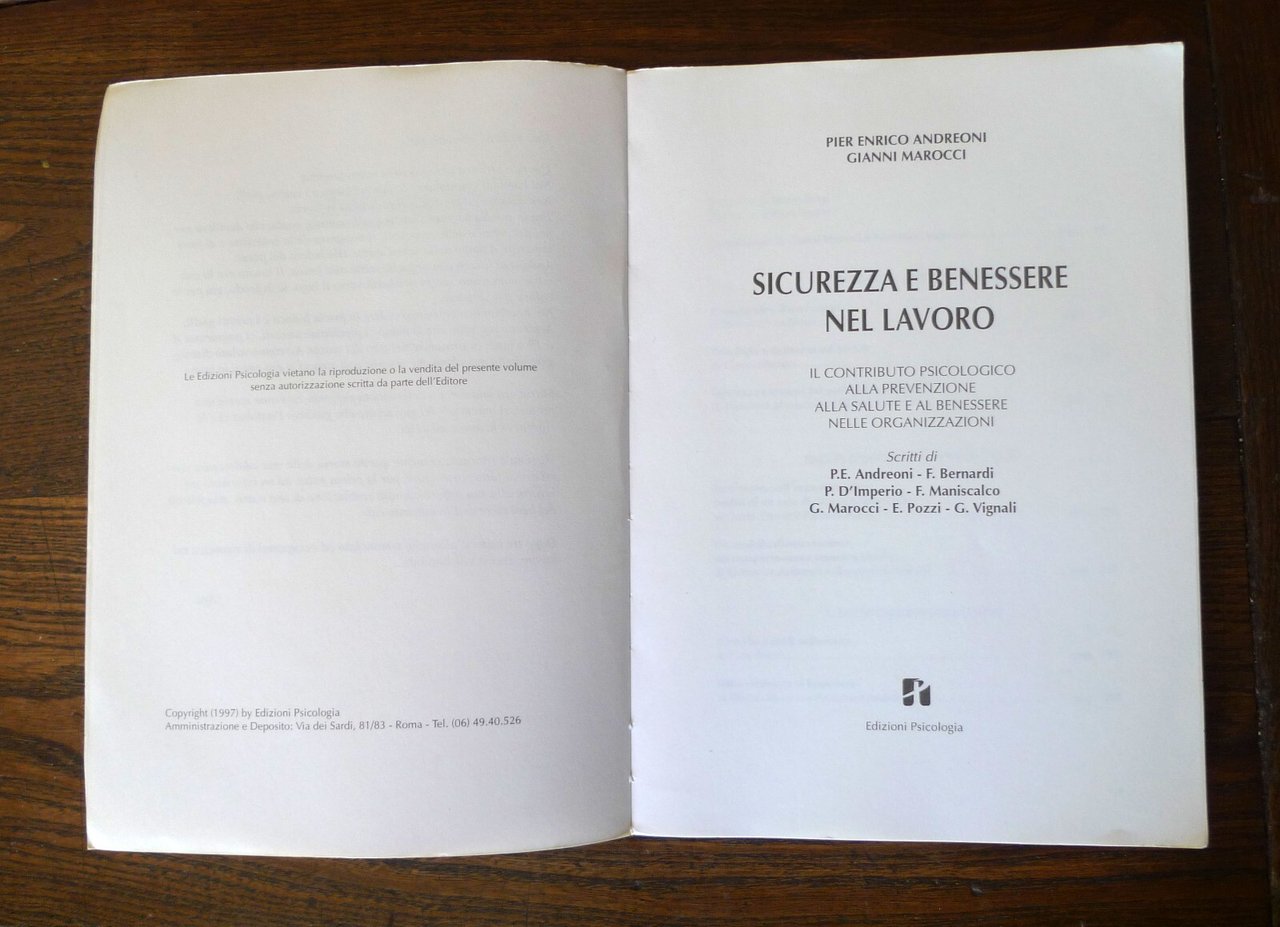 Pier Enrico Andreoni, Gianni Marocci,SICUREZZA E BENESSERE NEL LAVORO.Il contributo psicologico alla prevenzionealla salute e al benessere nelle organizzazioni.Prefazione di Marco Biagi ed Enzo Spaltro,Edizioni Psicologia, Roma 1997,brossura, 24x17 cm., pp.347,peso: g.650cod.9366CONDIZIONI DEL LIBRO: ottime,imperfezioni alla copertina