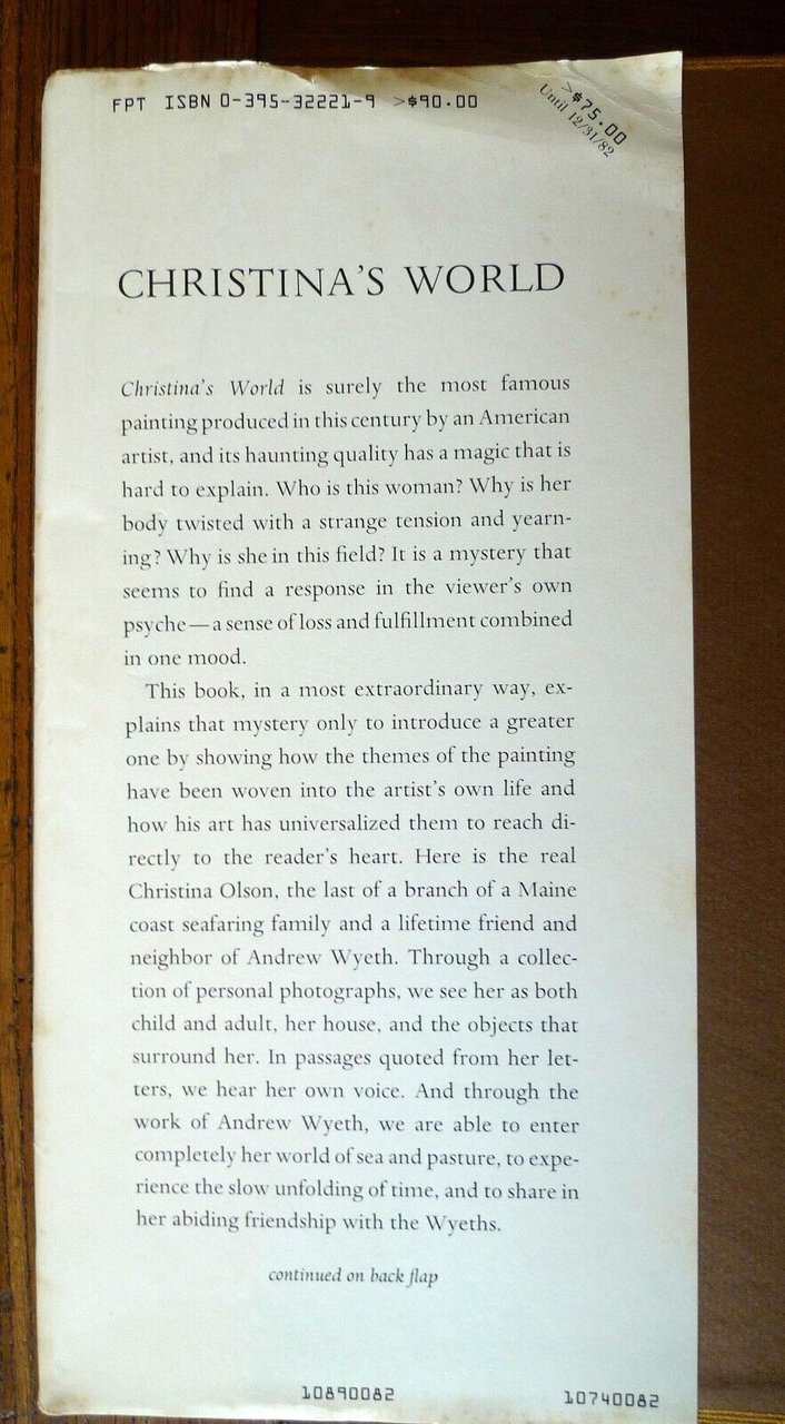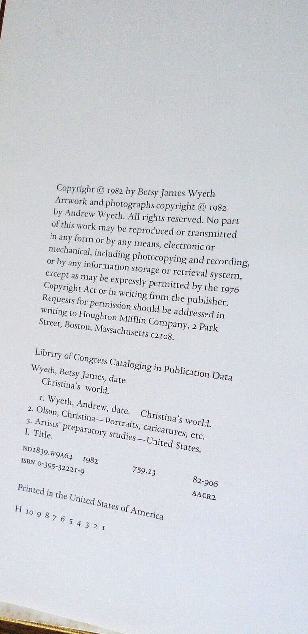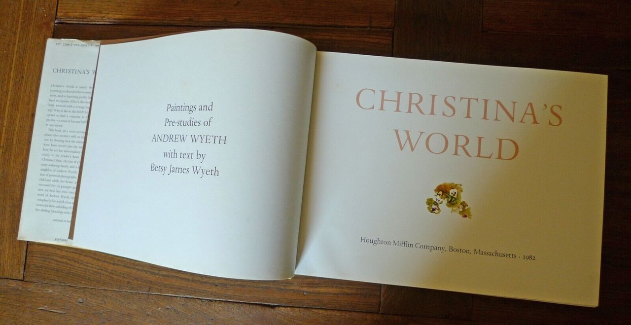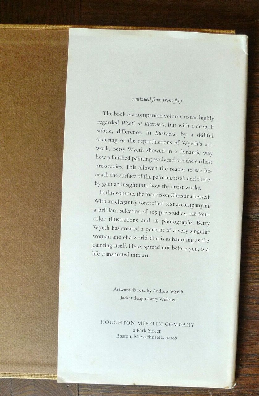 CHRISTINA'S WORLD.PAINTINGS AND PRE-STUDIES OFANDREW WYETHWITH TEXT BY BETSY JAMES WYETH.Houghton Mifflin Company, Boston Massachusetts, 1982,copertina rigida, rilegatura in tela,sovraccoperta illustrata, 34x27 cm., pp.281,illustrazioni in nero e a colori,testo in inglese,ISBN: 0-395-32221-9,peso: kg.3