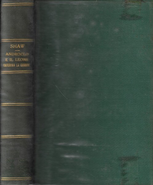 Due opere dello stesso autore rilegate in un unico volume. Androloco e il leone, un prologo e due atti, tradotto dall'originale inglese Androcles and the lion da Antonio Agresti e Caterina la grande, quattro atti, tradotta dall'originale inglese Great Caterinadallo stesso Agresti. Legatura in tela verde, con titoli e fili in oro solo al dorso, con lievi tracce di colla ai piatti e con fodera trasparente plastificata con alette. Tagli ingialliti; pagine anch'esse ingiallite, con segnapagina in stoffa rosso, salde e con ampio margine. Numero pagine 256.