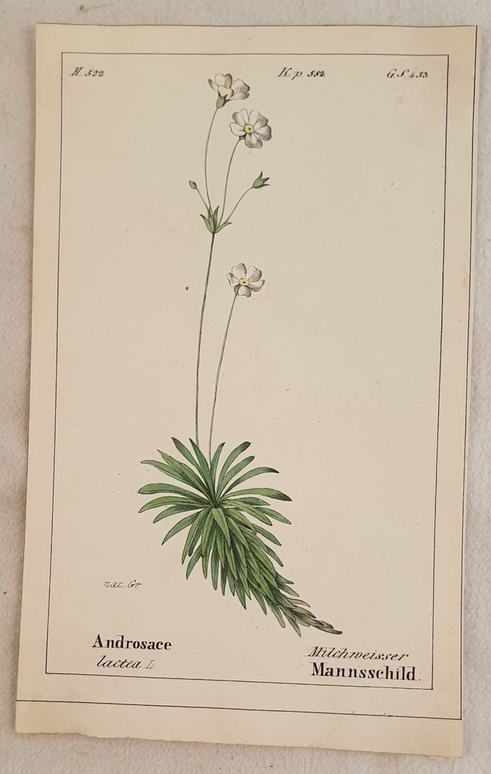 Bella cromolitografia del 1843 tratta dalla celebre opera di botanica "Flora der Schweiz" di Heinrich Romer sulla flora della Svizzera che rappresenta l'androsace lattea. In buone condizioni, qualche fioritura. Segni di colla al verso. Androsace lactea TECNICA: Cromolitografia DIMENSIONI FOGLIO: cm 17,5x11 DIMENSIONI INCISIONE: cm 16x9,5 EPOCA: 1843 CONDIZIONI: Buone condizioni, qualche fioritura. Resto di colla al verso.Beautiful chromolythography of 1843 taken form the famous work of botany "Flora der Schweiz" by Heinrich Romer about flowers of Switzerland representing the milkwhite rock jasmine.In good conditions, some foxings. Glue signs in the verso of page. Androsace lactea TECHNIQUE: Lytography PAGE SIZE: cm 17,5x11 PRINT'S SIZE: cm 16x9,5 PERIOD: 1843 CONDITION: good conditions with some foxings. Little tears in the lower edge. Glue signs in the verso of page.