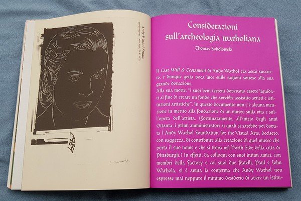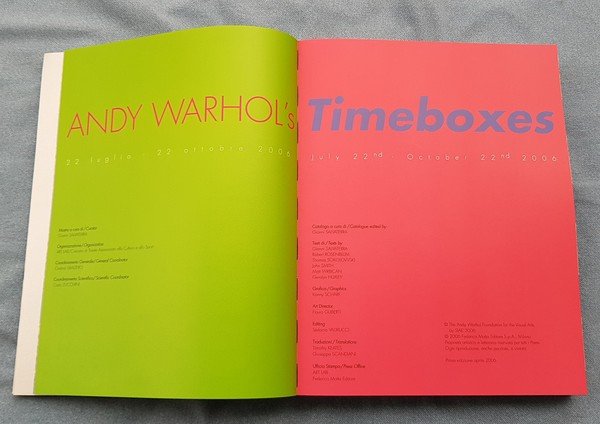 1 lingua: multi - italiano, inglese Legat. edit. rigida illustrata a colori con cofanetto, cm 36x28, pag. 344, edizione speciale a tiratura limitata di 499 copie - Concepito come vera e propria opera d'arte, il libro raccoglie oltre 450 soggetti e riproduce la grafica e l'impaginazione dell'Index Book di Warhol: oltre 300 pagine di 14 tipi di carta differenti, arricchite da pop up e invenzioni mobili che riproducono alcuni oggetti contenuti nelle originali Time Capsules dell'artista. Ogni copia è resa unica da esclusivi ex libris applicati a mano su appositi risguardi e dalla sequenza delle pagine, differente per ogni esemplare. Il volume è inoltre impreziosito da una copertina bodoniana in cartone dello spessore di sei mm, stampata su trama olografica plastificata argento metallizzato con effetti di trasparenza. Ciascun libro è confezionato in una preziosa scatola foderata con carte argentate sul cui coperchio è riprodotta, insieme al titolo, la trama di una famosa carta da parati warholiana. Un autentico contenitore che restituisce al volume l'idea delle originali Time Boxes dell'artista. - A cura di Gianni Salvaterra, Robert Rosenblum, Tom Sokolowski, John W. Smith, Matt Wrbicam, Geralyn Huxley. Publicato in occasione della mostra Andy Warhol Timeboxes, organizzata a Trieste nel 2006. Perfetto stato di conservazione.