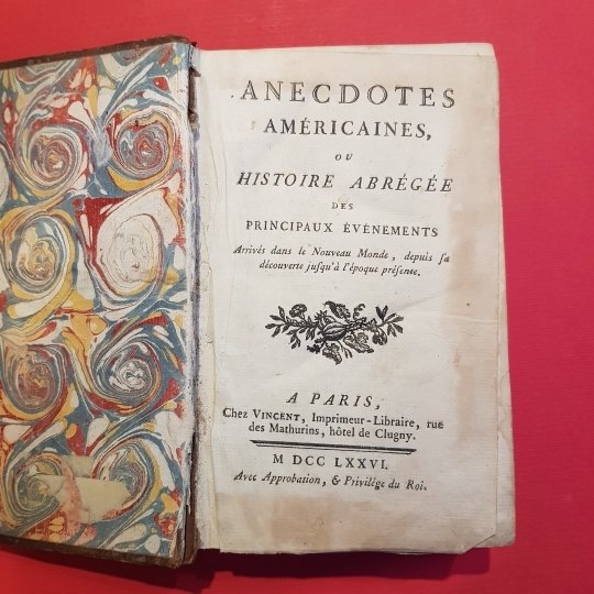 In-16° (cm. 17 x 10.5), pp. XV, 782, legatura coeva in piena pelle dell'epoca, dorso a cinque nervi, titolo su tasselo e fregi in oro. Lacuna al margine interno del frontespizio senza perdita. Buon esemplare. Il volume racconta i principali eventi della storia e della conquista del Nuovo Mondo dalla scoperta di Colombo fino al 1775. l'ultima parte è dedicata alla guerra franco-indiana (fronte nordamericano della guerra dei sette anni), e al periodo prima della Rivoluzione.