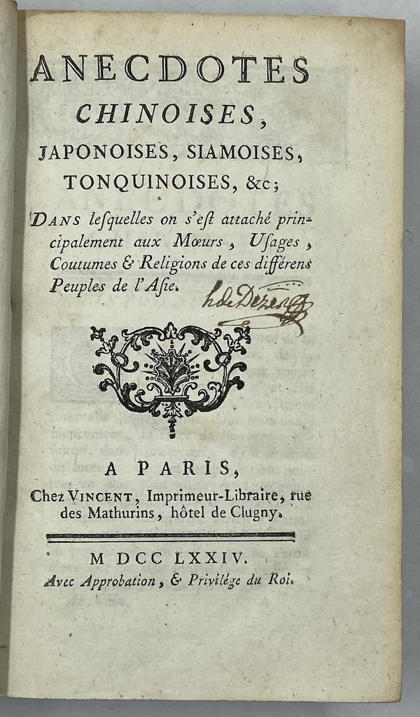 ANECDOTES CHINOISES, JAPONOISES, SIAMOISES, TONQUINOISES, &c; dans lesquelles on s’est attaché principalement aux Moeurs, Usages, Coutumes & Religions de ces différens Peuples de l’Asie. A PARIS, Chez VINCENT Imprimeur- Libraire, rue des Mathurins, hôtel de Clugny. MDCCLXXIV. [1774]