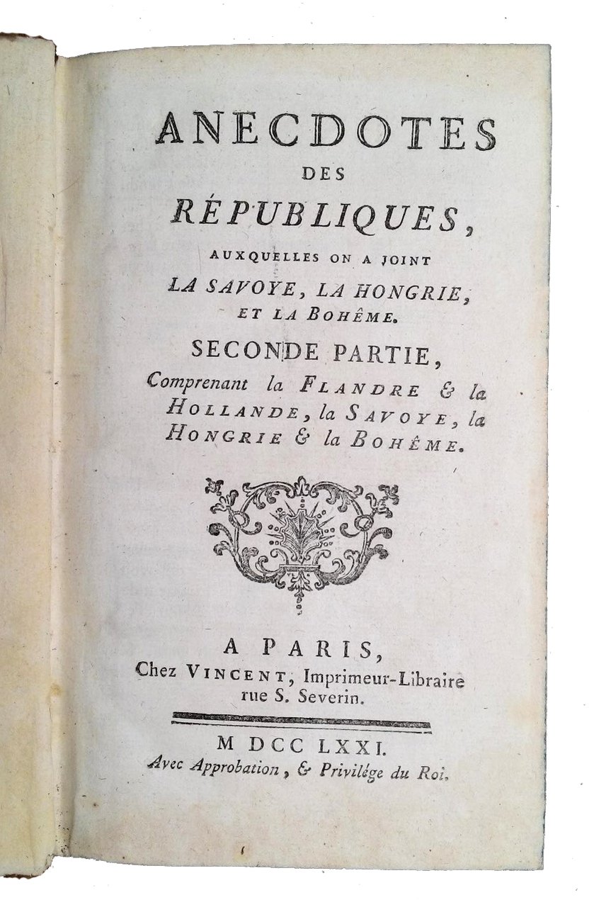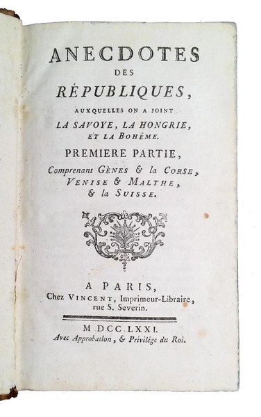 Anecdotes des républiques, auxquelles on a joint la Savoye, la Hongrie, et la Boheme. Premiere Partie, comprenant Gènes & la Corse, Venise & Malthe, & la Suisse.- Seconde Partie, comprenant la Flandre & la Hollande, la Savoye, Hongrie & la Bohême.