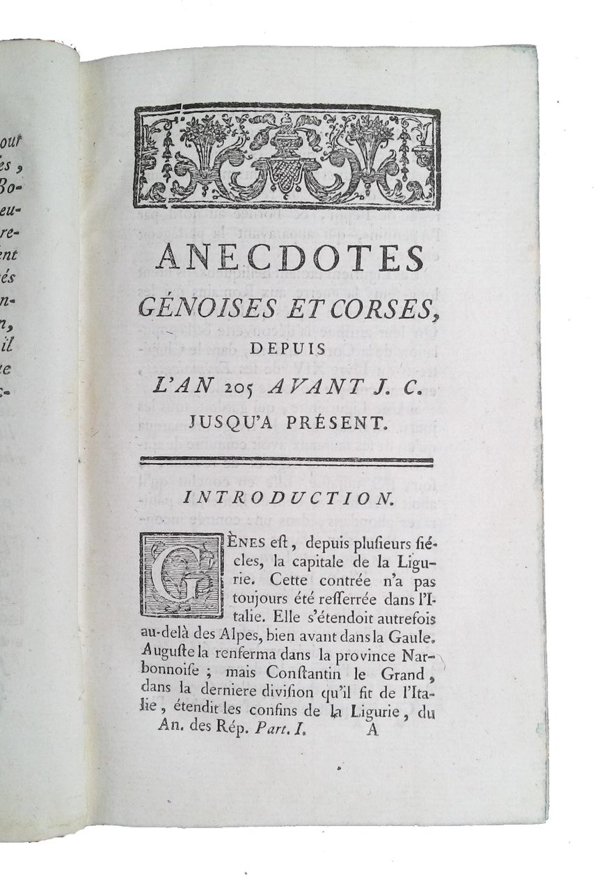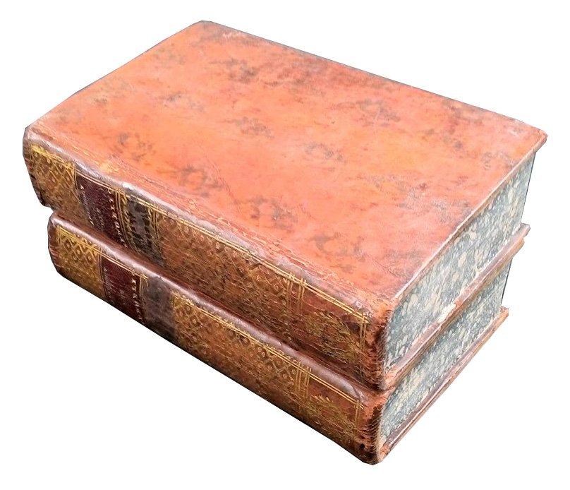 in-8° (168x104 mm); leg. in piena pelle marrone chiara marezzata, dorsi lisci interamente ornati con losanghe e decori dorati, titolo a caratteri dorati su tassello in pelle rossa, stemma nobiliare dorato in basso al dorso (appartenente alla famiglia Gayet de Sensol), guardie in carta marmorizzata, tagli di colore verde marmorizzati, nastrini segna-pagina; 2 vol.; pp. VIII, 288, 298, 218; (2), 322, 116, 154, 208; fregio xilogr. sui front.; iniz. e fregi xilografici. Edizione originale di quest'opera di storia aneddotica relativa alle repubbliche a cura del Delacroix. L'opera comprende riferimenti a: Genova, la Corsica, Venezia, Malta, la Svizzera, la Fiandra, l'olanda, la Savoia, l'Ungheria e la Boemia. Jean-François Delacroix, o de Lacroix (1753-1794), è stato un politico francese che, implicato nello scandalo della liquidazione della Compagnia francese delle Indie Orientali, fu processato e ghigliottinato. Prov.: Stemma nobiliare dorato in basso al dorso (appartenente alla famiglia Gayet de Sensol). Rif.: IT\ICCU\UBOE\019217 (4 copie). OCLC, 8900784. Barbier, I, 181. Cond.: Piccole tracce di foratura di tarlo sulla legatura e abrasione al dorso sotto ai tasselli; opera completa, quasi in ottime condizioni generali. -- 2 vol. in-8, VIII-288-298-218, [2]-322-116-154-208 p., plein veau brun de l'époque, dos lisses entièrement ornés de motifs dorés en losange, pièces de titres et de tomaison maroquinées rouges et noires (pièces de tomaison effacées ou manquantes), armes dorées en pied de dos de la famille Gayet de Sensol, 5 petits trous de vers aux rel., pet. manque p. 119 (t. 2), qq. bruniss. et mouill., cach. aux pages de titre; sinon bel exemplaire. Tranches marbrées, gardes peignées. -- ORIGINAL EDITION OF A COLLECTION WORK OF ANECDOTAL HISTORY CONCERNING THE REPUBLICS. Small traces of worm at the binding and abrasion at the spine under the title-labels; complete work, in very good condition/quite fine.