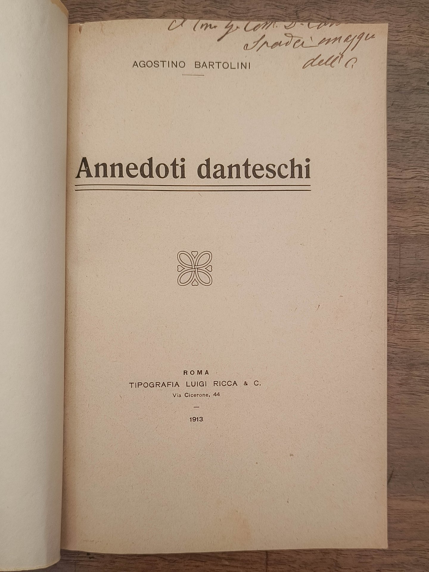 Aneddoti danteschi, Roma, Tipografia Luigi Ricca, 1913. Cm 20,2. Pp. 73. Brossura moderna muta. Dedica autografa dell'autore parzialmente mutila a "… Spada".