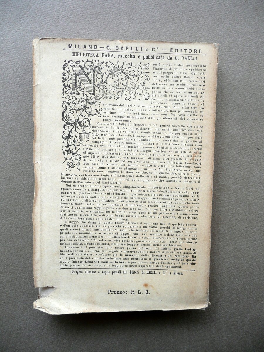 Plauto, Anfitrione Commedia di Plauto Voltata in terza rima da Pandolfo Collenuccio Aggiuntovi il dialogo dello stesso tra la berretta e la testa Premesso il discorso di Giulio Perticari Intorno alla vita e alle opere dell'autore G. Daelli e C. (collana Biblioteca Rara"), Milano 1864; cm 16x11; pp. XX-208; brossura ed. con bella cornice in b/n alla brossura ant. Condizioni di conservazione Esemplare ben conservato con tracce d'uso e alcune piccole lievi bruniture; brossura con trascurabili accenni di sporco, qualche minuscolo strappetto e una piccola mancanza ai margini; dorso con parziale fessurazione e poche minuscole mancanze, con conseguente lieve allentamento delle cuciture; uno spp. 83-94 staccate dal corpo del testo (vedi foto). Qualche pagina ancora intonsa. SETT129.L12812 N P "
