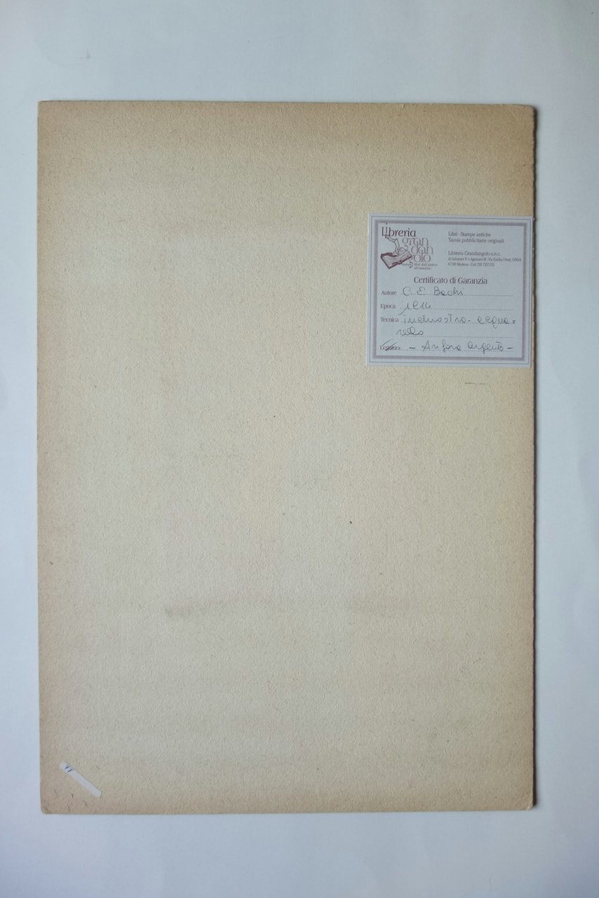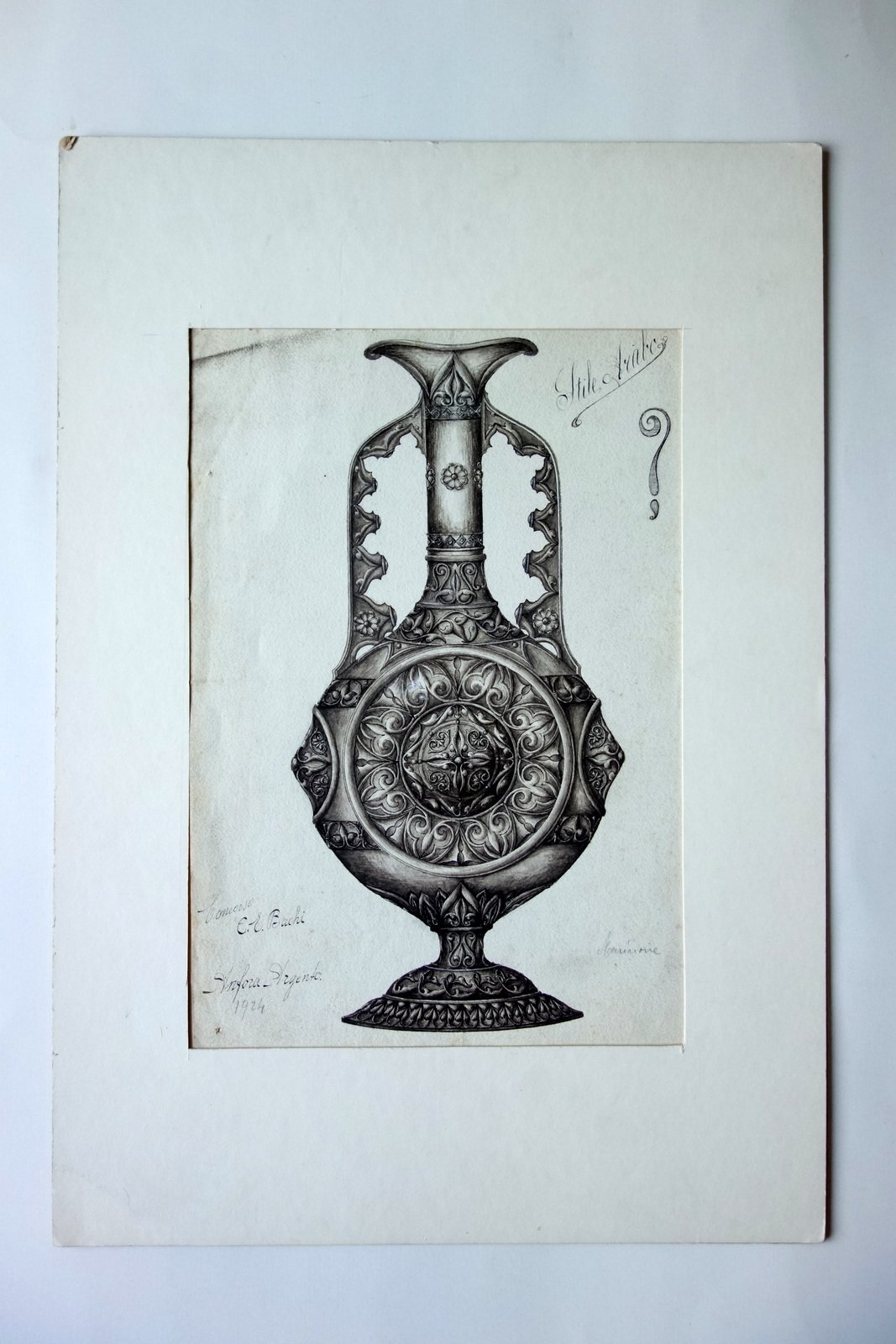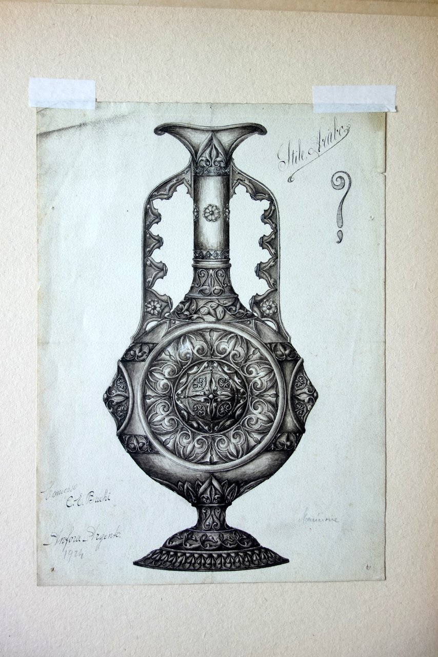 Disegno (tecnica mista), Anfora d'argento stile arabo firmata E. S. Bianchi 1924 1924; disegno originale realizzato su cartoncino, tecnica mista acquarello / inchiostro (vedi foto). Il disegno è applicato entro passepartout cartaceo. Certificato di garanzia al retro del passepartout. Cm 33x24 (disegno); cm 49x34,5 (passepartout). Condizioni di conservazione Disegno in buone condizioni con minimi aloni e accenni di sporco, lievemente rifilato, pochi minuscoli marginali forellini per precedente affissione. Per maggiori dettagli vedi foto. Originale. EXTRA.0506 N