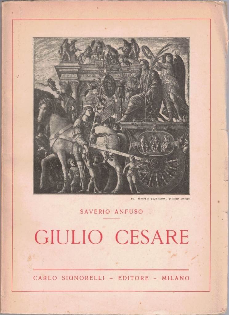Saverio Anfuso, Giulio Cesare. Monografia storica per le scuole e per le persone colte, Carlo Signorelli Editore, Milano 1935, pp. 143, ill. b.n., 5 c. di tavv. f.t. ill. b.n., cm 25, br. ed. In appendice: Il trionfo di Giulio Cesare, di Andrea Mantegna, con la descrizione di Volfango (Wolfgang) Goethe. Minime fioriture, lievissima brunitura della carta, per il resto perfetto. Intonso.