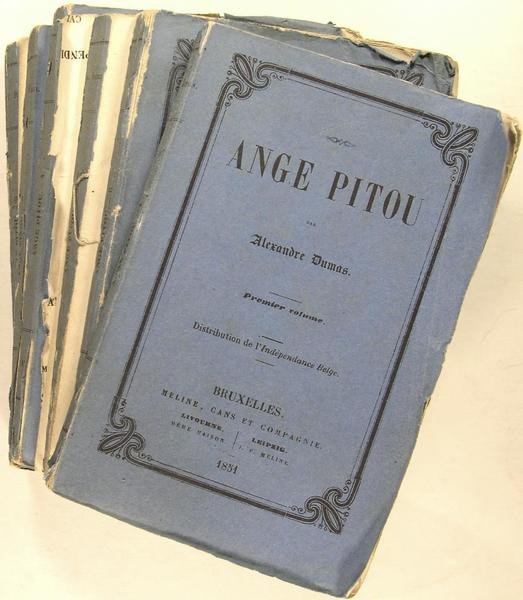 Distribution de l'Indépendance Belge, Bruxelles, 1851, 6 volumes, in/12 broché. 157p., 148p., 166p., 143p., 176p., 163 pages, manque la couverture du vol. 5 ; des petits manques sur les dos. L'Indépendance belge est un quotidien publié à Bruxelles pendant plus d'un siècle, qui a bénéficié d'une renommée internationale au milieu du XIXe siècle. Il est fondé en 1831 par Marcellin Faure, qui lancera en 1850 un autre quotidien libéral, L'Étoile belge. C'était les deux titres belges les plus lus avant 1870. Écrit en collaboration avec Auguste Maquet et paru sous forme de feuilleton dans La Presse en 1850 et 1851, ce roman est la troisième partie d'une série intitulée Mémoires d'un médecin, dont la première partie est intitulée Joseph Balsamo et qui se poursuit avec Le Collier de la reine, Ange Pitou et La Comtesse de Charny.