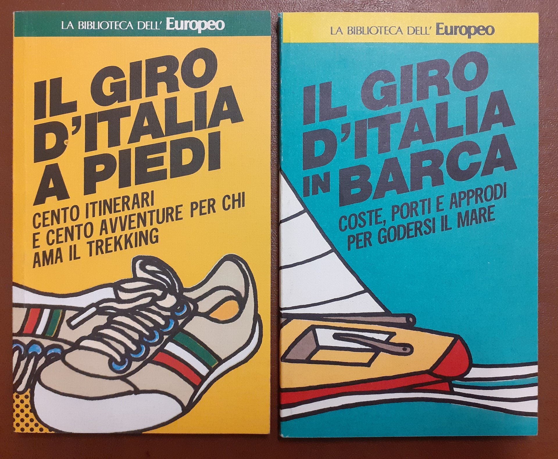 Roberto Angelino, Il giro d’Italia a piedi, s.l. (ma stampato a Milano, presso la Rizzoli Editore) 1985, pp. 93, cm 18, br. ed. (Collana La biblioteca dell’Europeo. Supplemento al n. 30 dell’Europeo. Sottotitolo alla prima di copertina: Cento itinerari e cento avventure per chi ama il trekking). In lotto con: Giampiero Manfredini, Il giro d’Italia in barca, s.l. (ma stampato a Milano, presso la Rizzoli Editore) 1985, pp. 123, ill. b.n., cm 18, br. ed. (Collana La biblioteca dell’Europeo. Supplemento al n. 32 dell’Europeo. Sottotitolo alla prima di copertina: Coste, porti e approdi per godersi il mare). Il lotto comprende i due volumetti Il giro d’Italia a piedi, di Roberto Angelino e Il giro d’Italia in barca, di Giampiero Manfredini, entrambi supplementi all’Europeo, nn. 30 e 32, collana La Biblioteca dell’Europeo. Minime tracce d’uso, leggera brunitura della carta, per il resto ottimi esemplari.