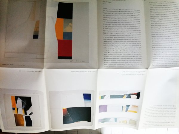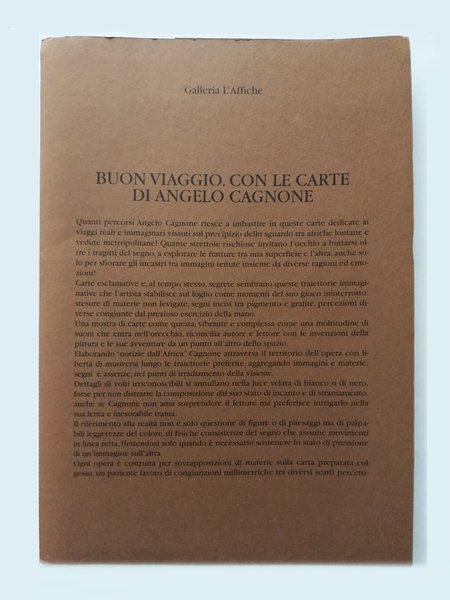 Cartellina con patella formato 31X22 contenente 2 fogli formato 86X60 piegati in piu parti con le opere a colori di Cagnone. Testo di Claudio Cerritelli. Catalogo edito in occasione della mostra alla Galleria l Affiche. Bella copia