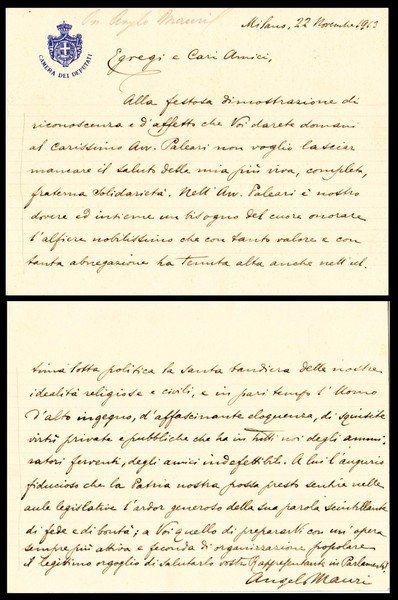 biglietto manoscritto e firmato di Angelo Mauri di 2 facciate su carta intestata "Camera dei Deputati" datato Milano 22 Novembre 1913; ottimo es.