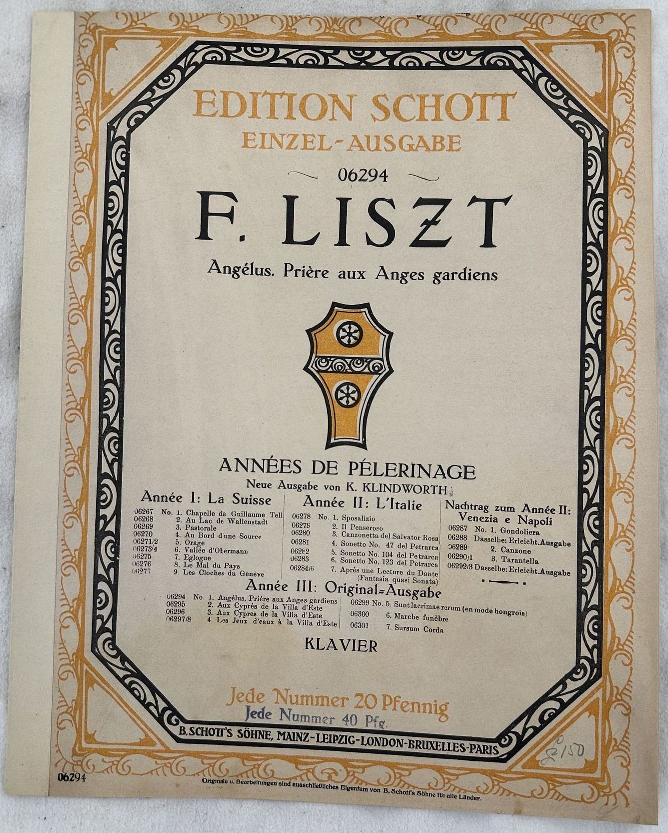 Edizione del 1912 della melodia "Angelus priere aux anges gardiens" di Franz Liszt (1811-1886) dall'opera "Annees de pelerinage". Copertina illustrata. In buone condizioni. Copertina editoriale in buone condizioni con lievi usure marginali. Dorso ricoperto da carta. Legatura in buone condizioni. Pagine in buone condizioni con rare fioriture. In Folio. cm. 32x25,5. Pp. 7. Edition of 1912 of the melody "Angelus priere aux anges gardiens" by Franz Liszt (1811-1886) from the opera "Annees de pelerinage". Illustrated cover. In good conditions. Editorial cover in good conditions lightly worn in the extremities. Spine covered by paper. Binding in good conditions. Pages in good conditions with occasional foxing. In Folio. cm. 32x25,5. Pp. 7.