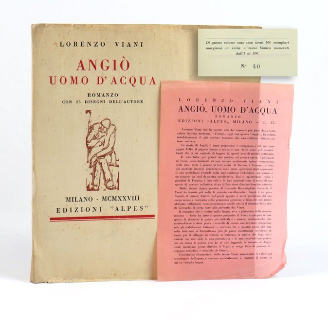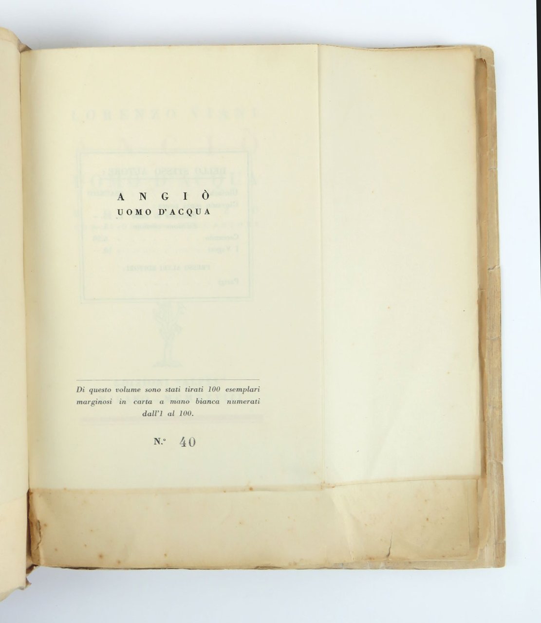 LIBRO Edizione originale, tiratura di testa. Eccezionale esemplare nella tiratura numerata da 1 a 100, stampata su carta a mano bianca a fogli diseguali e copertina con ampissime unghiature: esemplare numero 40, in complessive ottime condizioni (localizzati restauri non invasivi all’unghiatura di copertina; sobria dedica manoscritta di personaggio non identificato alla prima carta («Panfilo alla sua Leila questo compagni di tanti anni solitari Pisa 2 gennaio 1972»); conserva la scheda bibliografica stampata su leggera carta rosa. Rarissima tiratura di gran pregio su carta grande a fogli diseguali, “alla francese”, stampata in soli 100 esemplari numerati. «Angiò uomo d’acqua» è probabilmente il capolavoro del Viani narratore. È stato appena ripubblicato dalla casa editrice «Le Lettere», erede della storica Sansoni, per le cure di Marco Marchi (Firenze 2021). La poetica e sofferta storia di Angiò, al secolo Angelo Bertuccelli, personaggio della Viareggio di fine Ottocento, marinaio affetto da nanismo che fa voto di rinunciare al mare dopo essere miracolosamente scampato a una terribile tempesta e si ritira a vivere da eremita / clochard in una baracca in riva al mare.