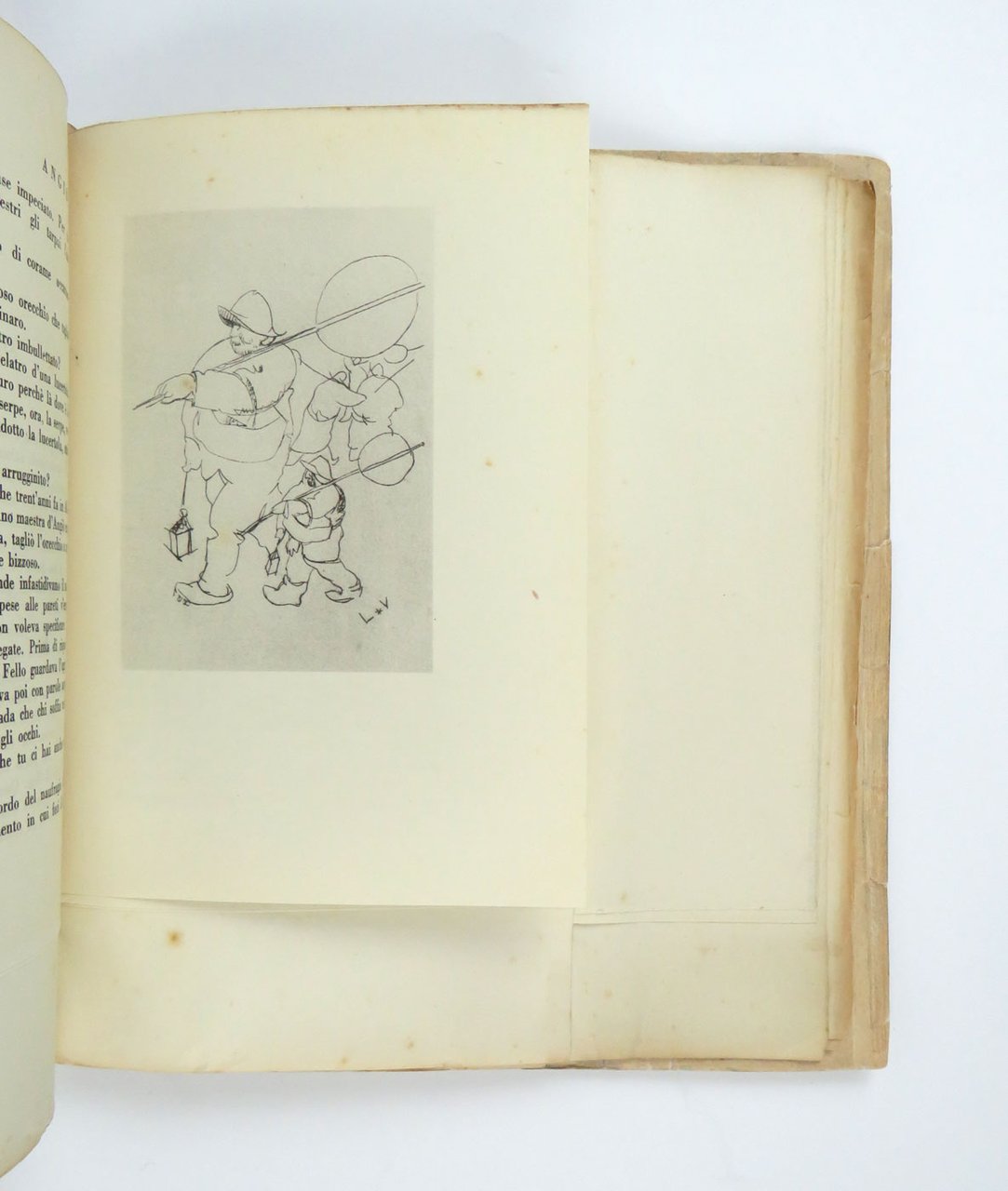 • pp. 214 [2] XXI (l’«Elenco alfabetico dei termini marinareschi e delle voci meno comuni usate in questo romanzo») [3]; 25 disegni a piena pagina fuori testo dell’autore stampati su carta semi patinata.