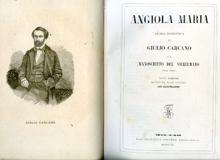 In-8°, pp. (10), 402, legatura coeva m. pelle verde con titolo in oro su dorso a nervetti decorati in oro, piatti con ricche decorazioni floreali verdi a secco. Sguardie marmorizzate. Ritratto dell'autore all'antiporta. Illustrazioni xilografiche n.t. e f.t., fregi tipografici incisi n.t. Testo entro doppio filetto tipografico. Firme di appartenenza alla prima bianca (una è del noto scrittore e critico Lorenzo Gigli). Fioriture usuali. Bell'esemplare. Nuova edizione riveduta dall'autore di questo romanzo ambientato sul Lago di Como del letterato lombardo, destinato a vastissima popolarità per tutto l'Ottocento italiano. Lo stile imita largamente quello di Manzoni, modello letterario del Carcano, mentre l'ispirazione risente della letteratura sentimentale e moraleggiante ottocentesca. Parenti, Rarità, V, p. 178-180. Carlo Cordié in Diz. Bompiani d. Opere, I, p. 161.
