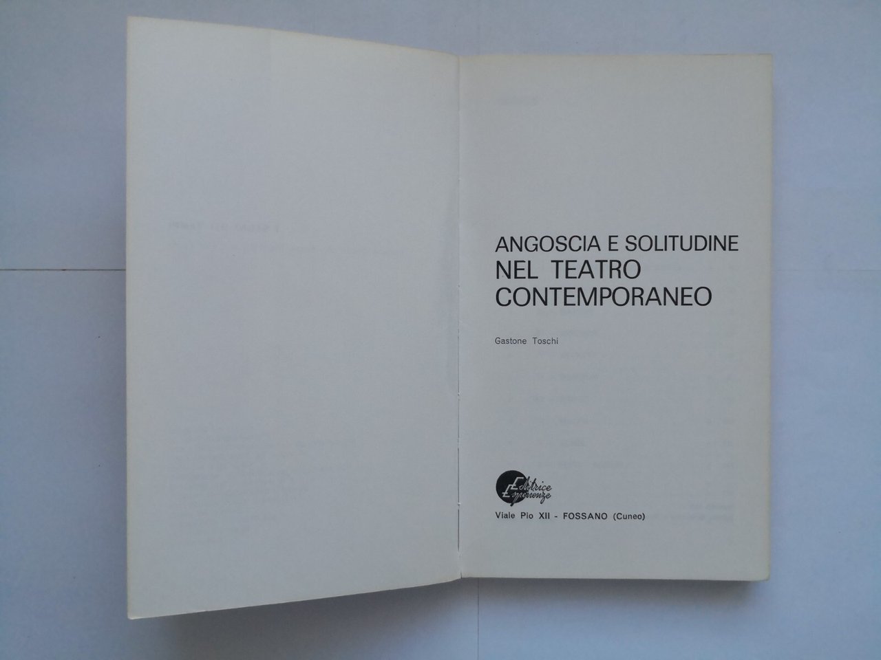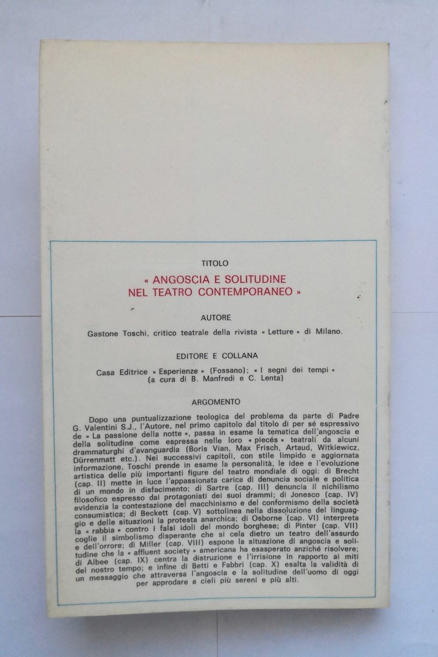ANGOSCIA E SOLITUDINE NEL TEATRO CONTEMPORANEO di Gastone Toschi 1970 Libro