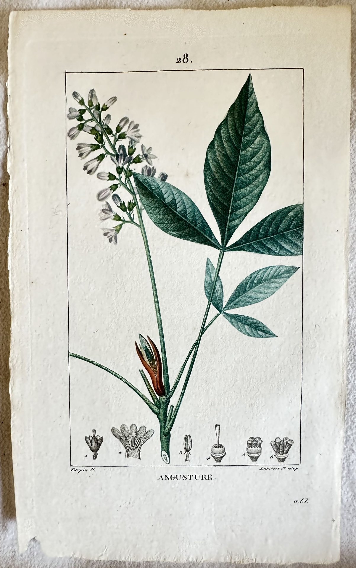 INCISIONE: Litografia con coloritura coeva all'acquarello AUTORE: Lambert su disegno di Turpin ATLANTE: Flore medicinale - Paris, Panckoucke 1814 DIMENSIONI FOGLIO: cm 21,5x13 DIMENSIONI INCISIONE: cm 15,5x9 EPOCA: 1814 CONDIZIONI: buone condizioni Quest'opera imponente era corredata da centinaia di incisioni che rappresentavano tutto il mondo animale e vegetale. L'opera deriva da un eccellente lavoro di luminari del XVIII secolo supportati dal Re francese Louis XV in seguito guidati dallo stesso Turpin, considerato al tempo il più grande incisore di botanica.<BR>La maggior parte delle incisioni sono firmate Turpin & Pretre.<BR>Carta bianchissima e resistente di ottima qualità.ENGRAVING: Lythograph with coeval colouring with acquarello painting AUTHOR: Lambert after Turpin ATLAS: Flore medicinale - Paris, Panckoucke 1814 SIZE OF PAGE: cm 21,5x13 SIZE OF THE ENGRAVING: cm 15,5x9 PERIOD: 1814 CONDITIONS: good condition This imponent work was made up of different volumes and contained hundreds of engravings that represented all the plant and animal kingdom.<BR>This work derives from an excellent work of luminaries of the 18th century supported by the french King Louis XV and then directed by the same Turpin that was considered as the greatest botanical engraver of his time. The most of his engravings are signed Turpin & Pretre.<BR>Very white strong paper of good quality.