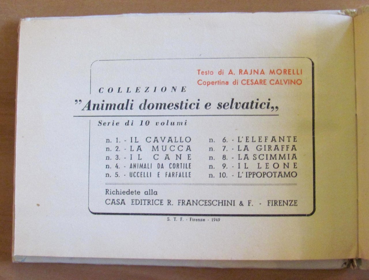 Collezione Animali Domestici e Selvatici N.4. Bella copertina a colori con particolare movibile di Cesare Calvino, 1 tavola a colori f.t. e 3 illustrazioni a piena pagina virate in rosso. Casa Editrice Franceschini - Firenze, 1949. Cartonato editoriale. 19x14; pp.15. Raro, Stato di Nuovo. , Ottimo (Fine)