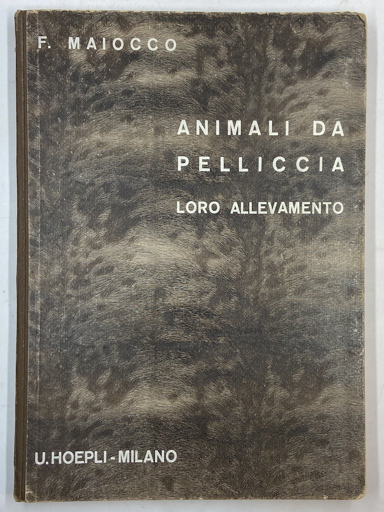 Legatura editoriale in mezza tela, cm25x35, pp XXIV 111 (1) (16) illustrate in nero. L’autore era direttore dell'Istituto Nazionale di Coniglicoltura di Alessandria; in calce all’opera bibliografia e statuto della Sezione Allevatori Animali da Pelliccia della Confederazione Nazionale Fascista degli Agricoltori, e alcune pagine pubblicitarie; in apertura notizie sulle esposizioni di Lipsia e Parigi del settore. All’interno notizie sull’allevamento del coniglio, la volpe argentata, il visone, il nutria, la pecora karakul, il topo muschiato, la martora e gli altri mustelidi, animali diversi (procione, opossum, tasso.). Il decoro dei piatti riproduce una pelliccia animale.