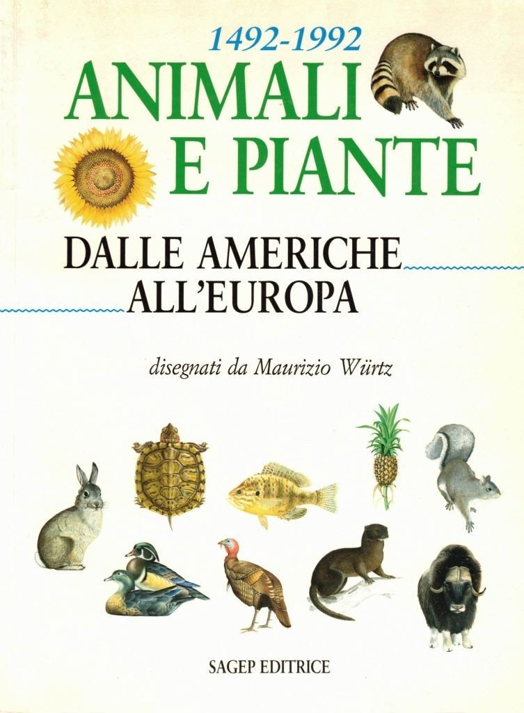Animali e piante. Dalle Americhe all’Europa. 1942-1992, disegnati da Maurizio Wurtz, Sagep Editrice, Genova 1992, pp. 71, ill. col., cm 27, br. ed. Nome dell’editore indicato in calce alla prima di copertina. In calce al frontespizio: Ente Autonomo Fiere di Verona – Edizione speciale per la rassegna: E l’agricoltura scoprì l’America, Fiera di Verona, 9 marzo-8 aprile 1992. La mostra 1942-1992: Animali e piante dalle Americhe all’Europa, realizzata in occasione delle Celebrazioni Colombiane del 1992, fu allestita presso il Museo Civico di Storia Naturale G. Doria di Genova dal 12 ottobre 1991 al 31 dicembre 1992 e presso la Fiera di Verona dal 9 marzo all’8 aprile 1992. Le tavole e le schede che compongono il presente catalogo sono tratte dal catalogo della mostra genovese e sono a cura di Lilia Capocaccia Orsini, Giorgio Doria, Giuliano Doria e Sagep Editrice. Il riadattamento dei testi è di Nadia Repetto. Minima ingiallitura ai margini, per il resto perfetto.