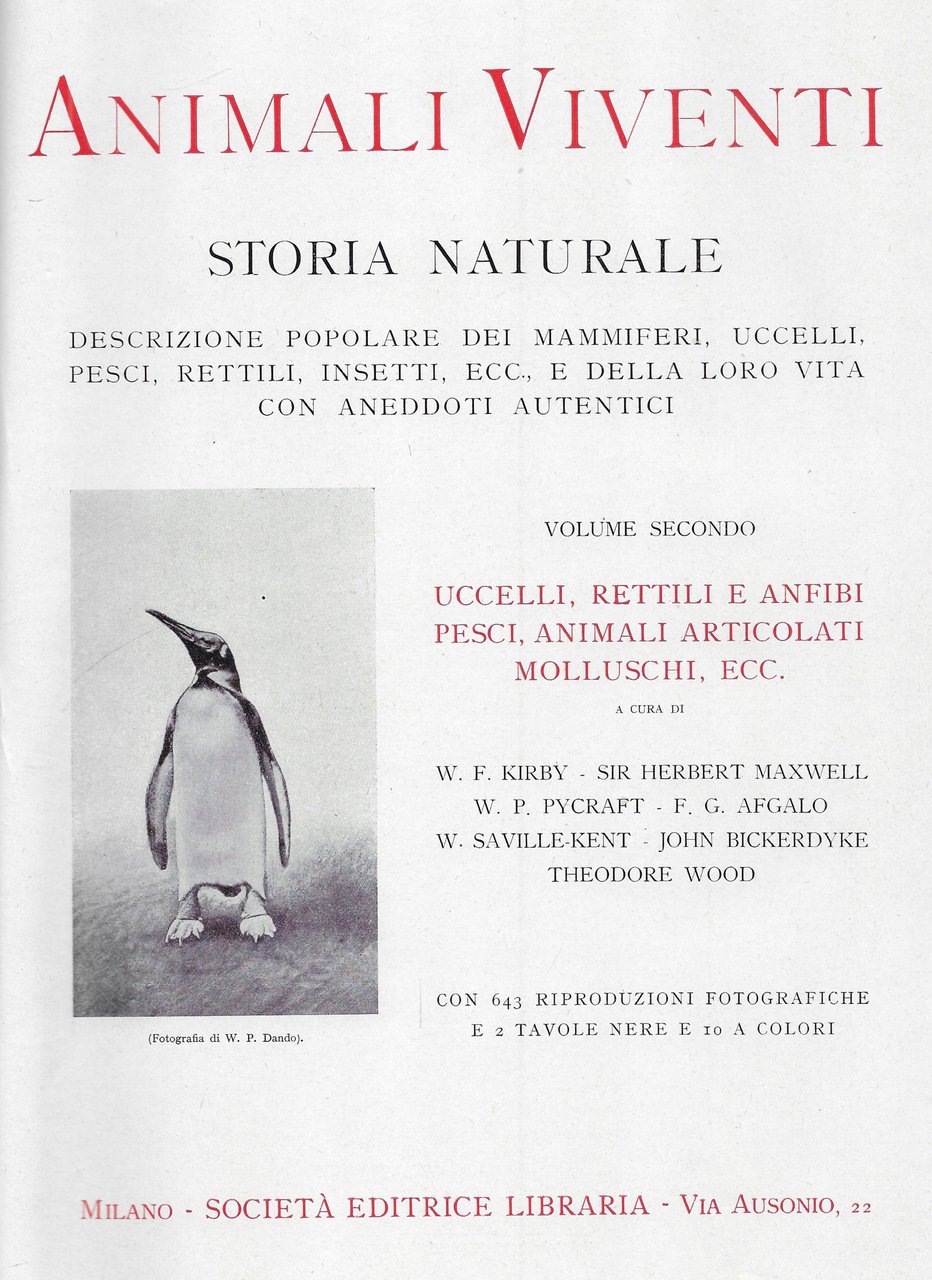 Volume secondo: "Uccelli, Rettili e Anfibi, Pesci, Animali articolati, Molluschi, ecc.", con 643 riproduzioni fotografiche in bianco e nero n.t., 2 tavole nere e 10 tavole a colori con velina protettiva f.t.