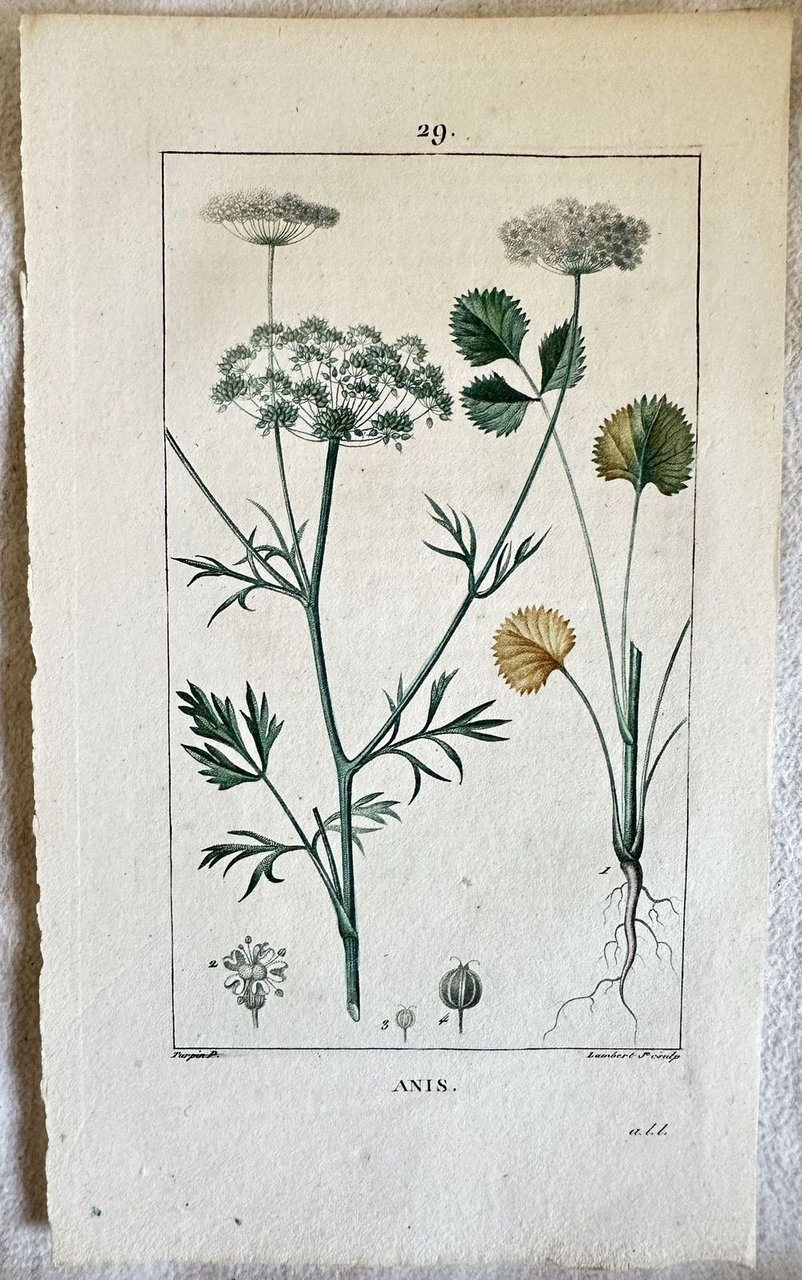 INCISIONE: Litografia con coloritura coeva all'acquarello AUTORE: Lambert su disegno di Turpin ATLANTE: Flore medicinale - Paris, Panckoucke 1814 DIMENSIONI FOGLIO: cm 21,5x12,5 DIMENSIONI INCISIONE: cm 15,5x9 EPOCA: 1814 CONDIZIONI: buone condizioni Quest'opera imponente era corredata da centinaia di incisioni che rappresentavano tutto il mondo animale e vegetale. L'opera deriva da un eccellente lavoro di luminari del XVIII secolo supportati dal Re francese Louis XV in seguito guidati dallo stesso Turpin, considerato al tempo il più grande incisore di botanica.<BR>La maggior parte delle incisioni sono firmate Turpin & Pretre.<BR>Carta bianchissima e resistente di ottima qualità.ENGRAVING: Lythograph with coeval colouring with acquarello painting AUTHOR: Lambert after Turpin ATLAS: Flore medicinale - Paris, Panckoucke 1814 SIZE OF PAGE: cm 21,5x12,5 SIZE OF THE ENGRAVING: cm 15,5x9 PERIOD: 1814 CONDITIONS: good condition This imponent work was made up of different volumes and contained hundreds of engravings that represented all the plant and animal kingdom.<BR>This work derives from an excellent work of luminaries of the 18th century supported by the french King Louis XV and then directed by the same Turpin that was considered as the greatest botanical engraver of his time. The most of his engravings are signed Turpin & Pretre.<BR>Very white strong paper of good quality.