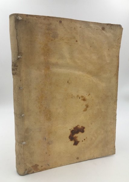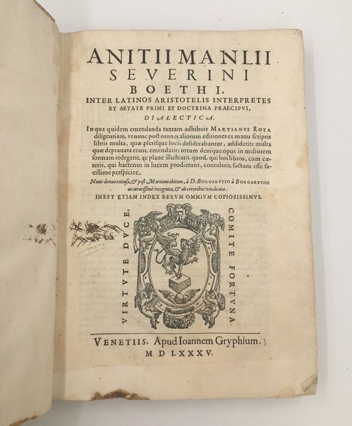 In-folio antico (cm. 31,6x22), cc. (6) + colonne 712. Superba grande MARCA TIPOGRAFICA FIGURATA al front. (grifone su globo alato entro ricca cornice ovale riccamente ornata e figurata con putti e ghirlande, ariete e frutti). Contiene 27 complesse FIGURE geometriche, molti schemi e molti bei CAPILETTERA (di cui solo uno è censurato con inchiostro). Bella solida pergamena floscia coeva con tit. anticam. ms. al ds., con 6 stringhe in perg. passanti alle cerniere e capitelli originali. Es. genuino in carta croccante perlopiù immacolata, salvo in due o tre quaderni uniformemente e lievemente bruniti. Gore a ca. 50 carte (ma fastidiose solo a 4 carte); macchie da inchiostro bruno solo agli estremi margini inferiori di metà del vol., sempre ben lontani dal testo e, solo a pochi margini, insignif. buchetti di tarlo. Striscetta asportata al marg. inf. del front., lontano dallo stampato. BOEZIO, discusso nell'ortodossia o venerato come martire, "ultimo dei Romani e primo degli Scolastici" (Grabmann), "véritable introducteur d'Aristote en Occident" (Mandonnet), qui si occupa della Logica e del metodo, sillogismi, predicabili, concetti, verità, contraddizione, previsione ecc. "A partire dal secolo XII, la "dialectica" di Boezio venne copiata sempre più di rado, e a questa "logica vetus" di testi elaborati esclusivamente da Boezio (pur apprezzatissimi da Tommaso d'Aquino), si integrarono in una "Logica modernorum" altri testi aristotelici come l'Organon (uniba.it). Ebbe molte ed. nel XVI sec., dal 1543 al 1585.