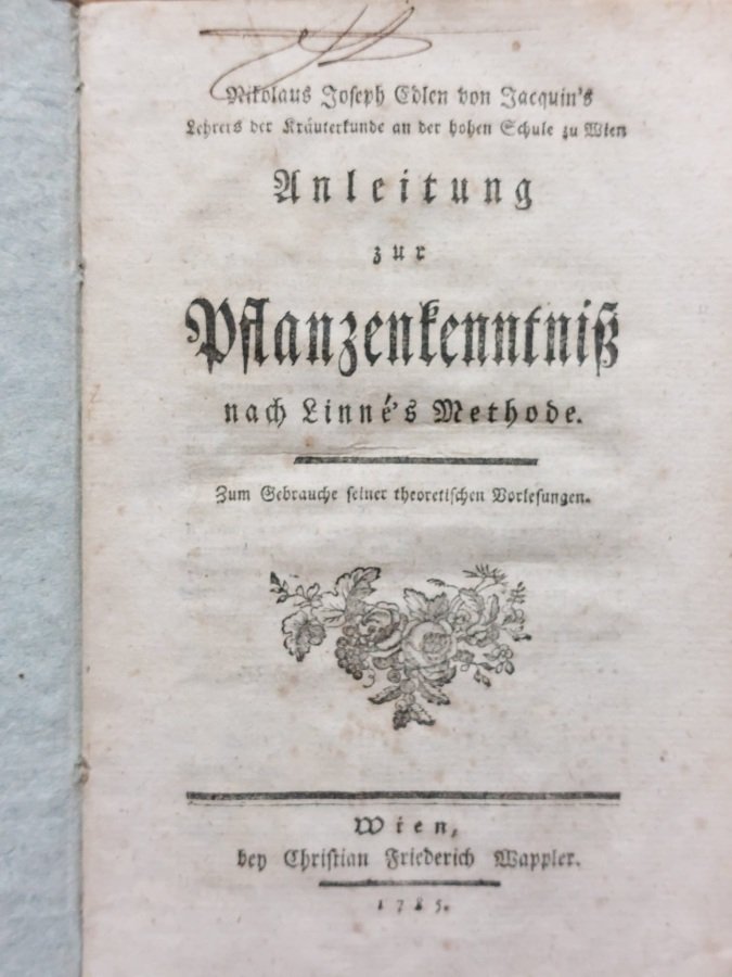 In-8° (cm. 20), cartoncino dell'epoca, pp. 171, [2] e 11 tavv. d'ill. calcografiche ripiegate f.t. di A. Amonise, graziosa vignetta floreale xilografica al front., così come la testatina e il finalino; alcune fioriture e una sigla antica ad inchiostro al margine del front., tavole legg. ifilate a margine. EDIZIONE ORIGINALE di questo studio botanico del Jacquin (1727-1817). «He took great care of the garden at Vienna, which under his superintendence became one of the most notable in Europe» [FERGUSON 432]. Per altre sue opere importanti cfr. GRAESSE III, 444. Buon esemplare. (SE1)