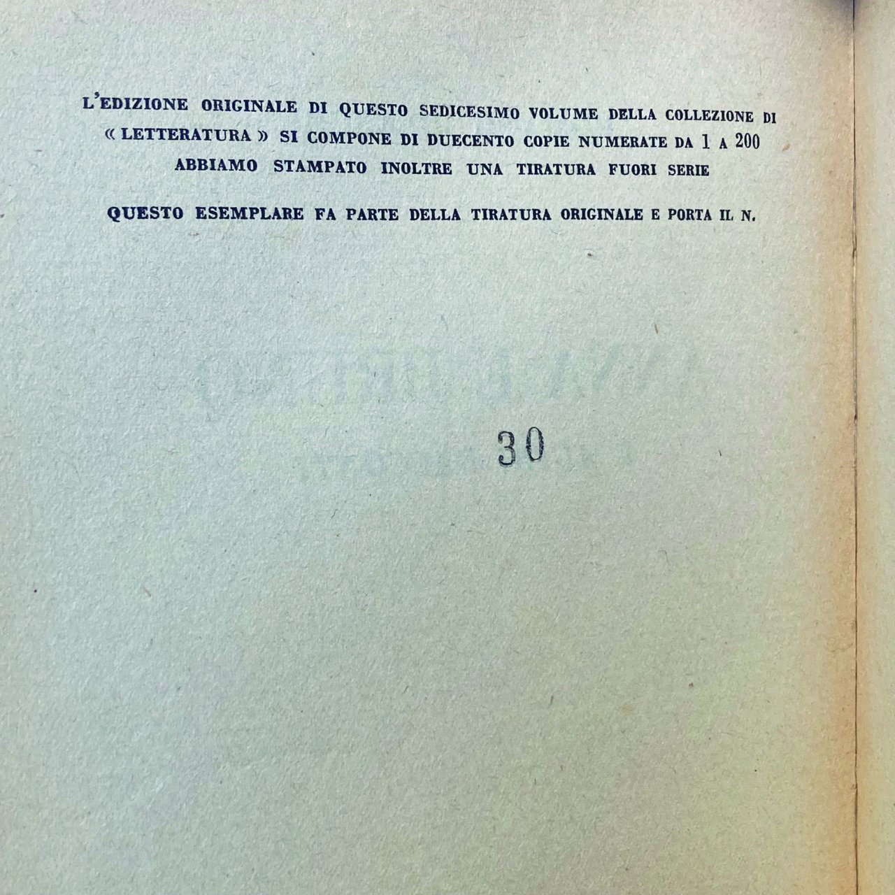 16°, pp. 152, brossura riquadrata a due colori. Collana: Letteratura. Stampato in 200 copie numerate, oltre a una tiratura fuori serie. Esemplare numero 30. Contiene 8 racconti di cui 6 già apparsi e 2 inediti. Restauro professionale agli angoli e alle cuffie, peraltro buono stato di conservazione.