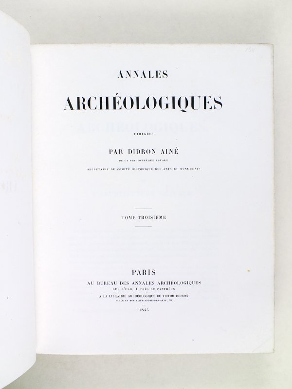 1 vol. in-4 reliure de l'époque demi-basane bleue, Au Bureau des Annales Archéologiques, 1845, 408 pp. avec 11 planches hors texte Etat moyen (reliure très frottée et abîmée, serpentes très fort. roussies mais bon état intérieur par ailleurs, avec seulement lég. rouss. sur les planches hors texte)