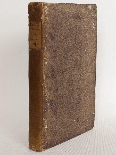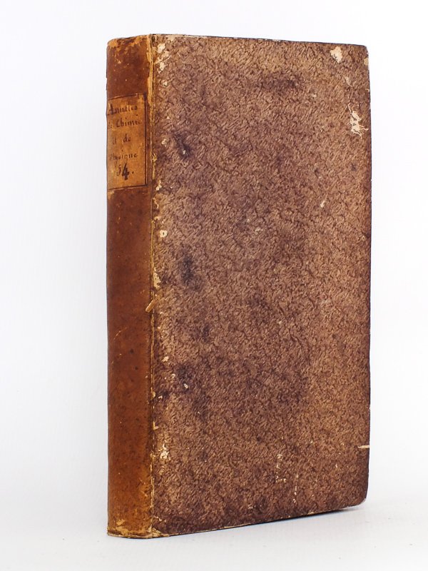 1 vol. in-8 cartonnage marbré de l'époque, Chez Crochard, Paris, 1833, 448 pp. avec 6 planches dépliantes. Contient notamment : Considérations sur la Composition des Atomes organiques (Berzelius) ; Mémoire sur le choc d'une Veine liquide lancée contre un plan circulaire (Félix Savart) ; Nouvelle analyse de la Coque du Levant (Pelletier et Couerbe) ; Eloge historique d'Alexandre Volta (Arago) ; Sur l'Extraction de l'Iridium et de l'Osmium du résidu noir de Platine (Wohler) ; Procédé des Chinois pour fabriquer les Tam-Tams et les Cymbales (Stanislas Julien) ; Mémoire sur le Tannin et les Acides gallique, pyrogallique, ellagique et métagallique (Pelouze) ; Mémoire sur quelques cas de Paralysie traités au moyen de l'Electricité produite par des appareils voltaïques (Marianini) ; Sur les raies que l'on observe à l'oeil nu à travers une fente étroite (Peclet) ; etc. Rare exemplaire du tome 54 des "Annales de Chimie et de Physique" contenant notamment le bel et important éloge historique de Volta rédigé par Arago. Etat moyen (cartonnage frotté avec ancienne restauration au dos, un travail de ver marginal aux premiers ff. affectant trois lettres)
